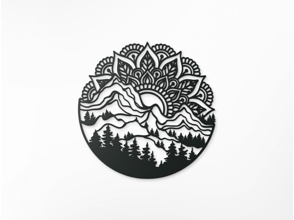 Zaveste si na stenu túto originálnu mandalu, na ktorej sú vyobrazené hory a mandala ako Slnko. Moderná mandala zapadne do každého interiéru. Mnohí veria, že na stene funguje nielen ako obraz, ale aj ako pomôcka na psychohygienu.
