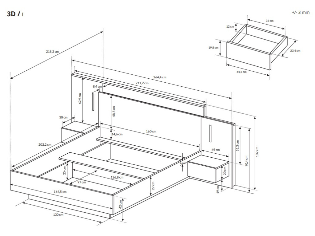 Rozmery postele sú 261,2 × 101,6 × 218,2 cm, pričom plocha spania má 160 × 200 cm. Matrac nie je súčasťou balenia, je možné ho dokúpiť z našej ponuky.