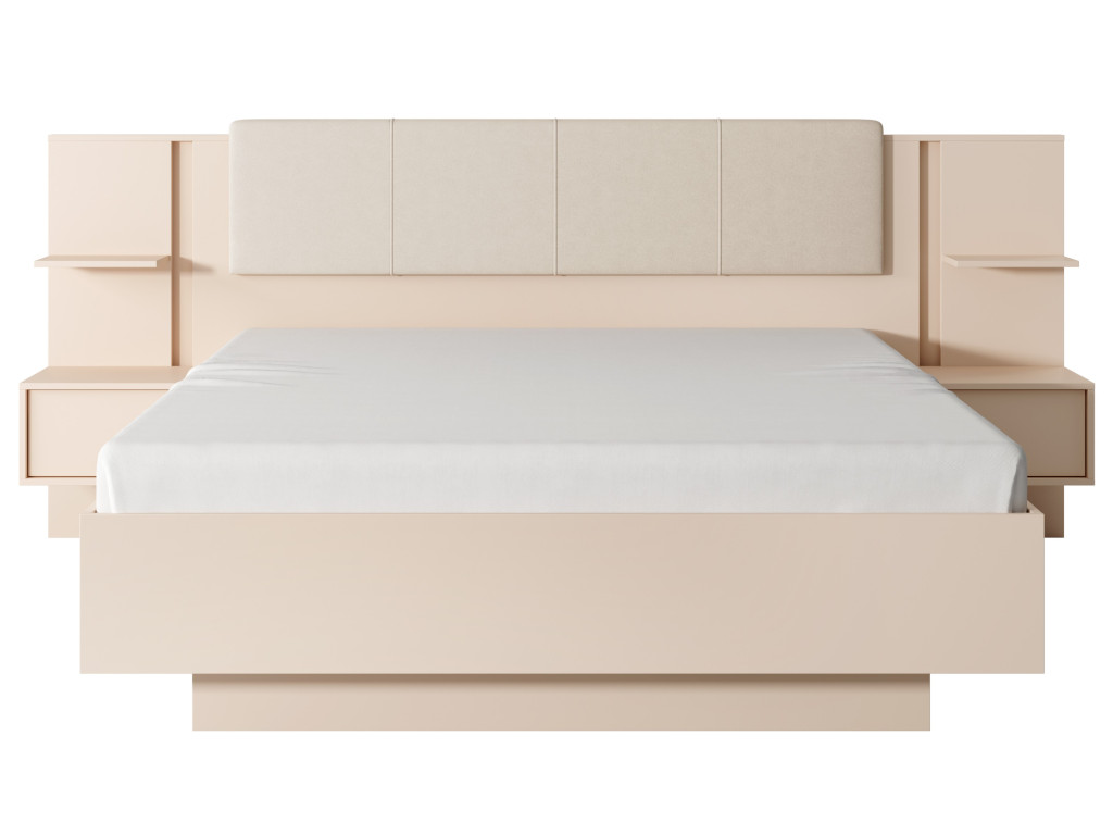 Manželská posteľ Dast K je elegantným centrom spálne, ktoré spája moderný dizajn s praktickými detailmi. Posteľ je vyhotovená v jemnej béžovej farbe, doplnenej o krémové čalúnené čelo, ktoré pôsobí útulne a zároveň poskytuje pohodlie pri čítaní či relaxovaní. Súčasťou konštrukcie čela sú aj integrované nočné stolíky – každý má jednu zásuvku a malú poličku nad stolíkom, čo poskytuje dostatok priestoru na odkladanie drobností.