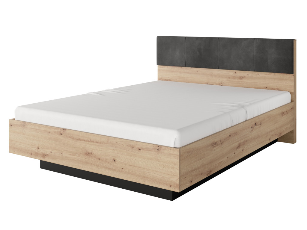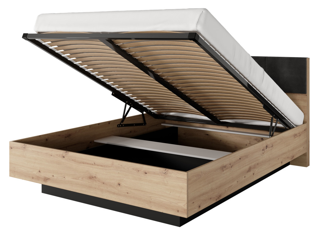 Manželská posteľ Tally – dub artisan / antracit s rozmermi 163,2 × 210 × 104 cm ponúka plochu spania 160 × 200 cm, elegantné čierne čalúnené čelo a praktický zdvíhací kovový rošt s úložným priestorom. Moderný vzhľad s kontrastom dreva a antracitu robí z tejto postele štýlový stredobod spálne.