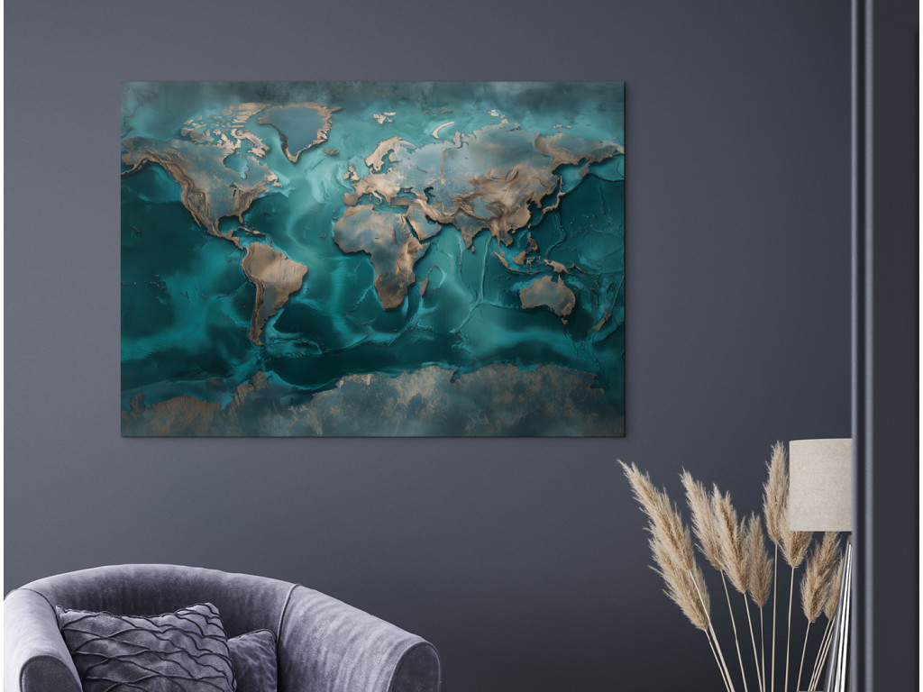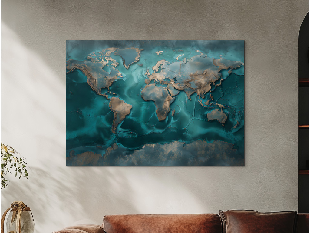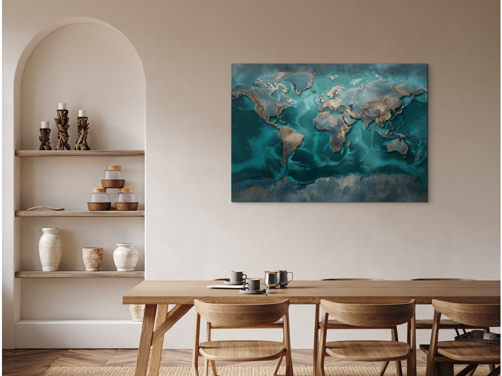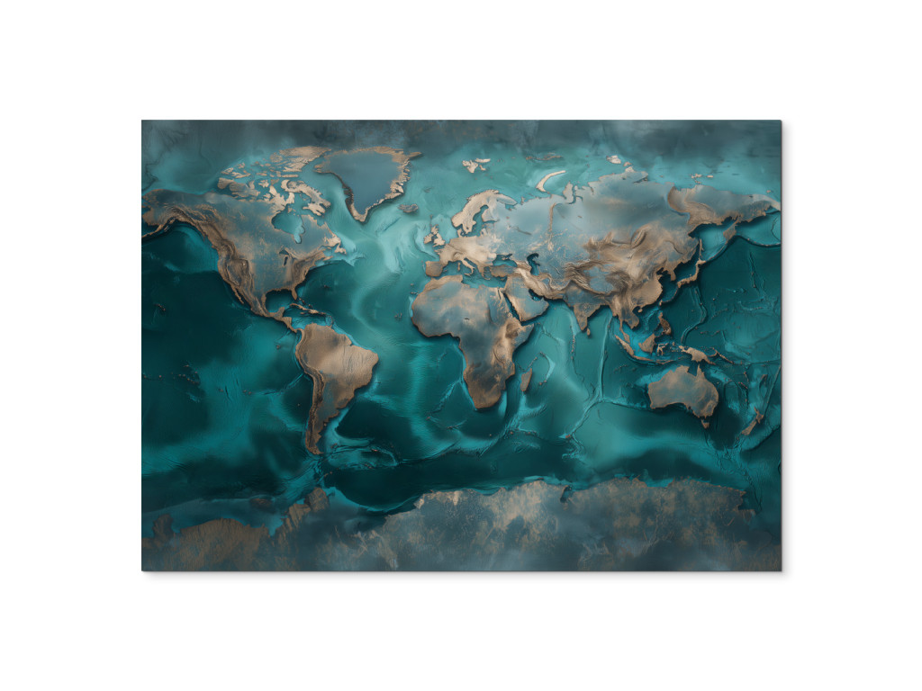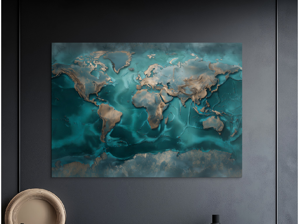 Dekoračná mapa sveta inšpirovaná technikou resin art zaujme pocitom a dojmom hĺbky. Tyrkysové a modré tóny s jemnými metalickými akcentmi pôsobia moderne a elegantne. Obraz je ideálny ako dizajnový prvok do moderného interiéru, kde má zaujať na prvý pohľad.