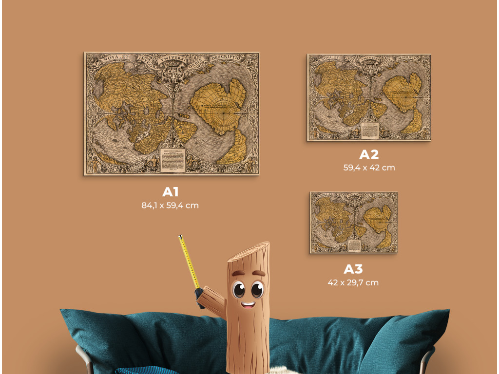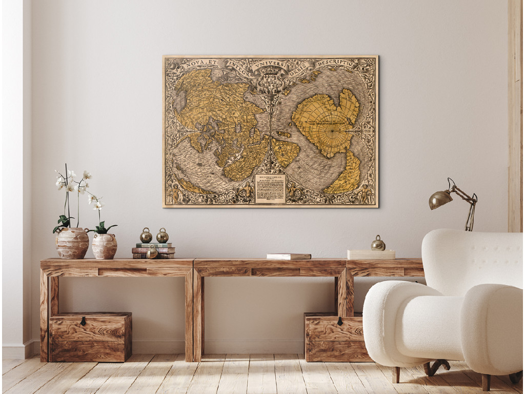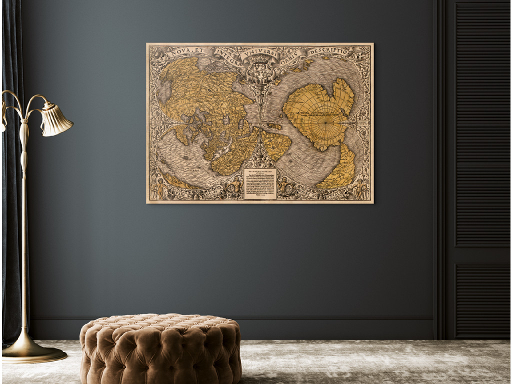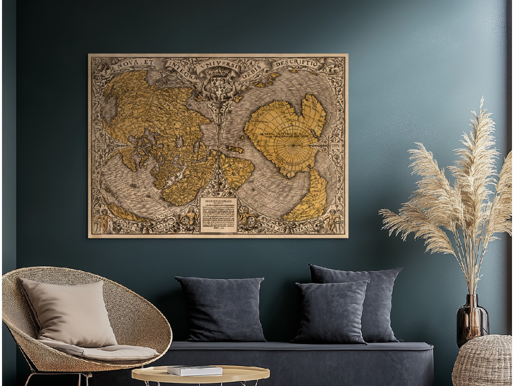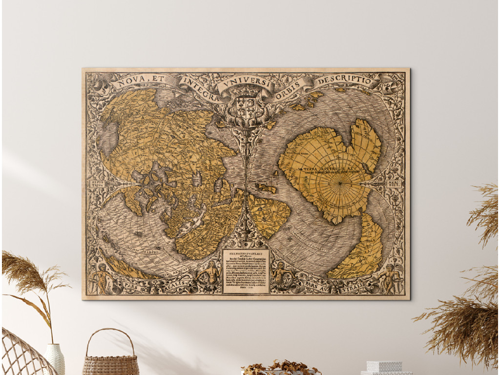Historická mapa sveta Nova et integra universi orbis z roku 1531 od francúzskeho kartografa Oronca Finea (Orontius Fineus) zobrazuje Zem v dvoch pologuliach s bohatou dekoratívnou bordúrou. Zaujímavosťou je rozsiahly južný kontinent Terra Australis, ktorého existencia bola v tom čase len hypotézou. Obraz pôsobí objaviteľsky a nadčasovo a hodí sa do pracovne, knižnice alebo interiéru so záujmom o históriu a kartografiu.