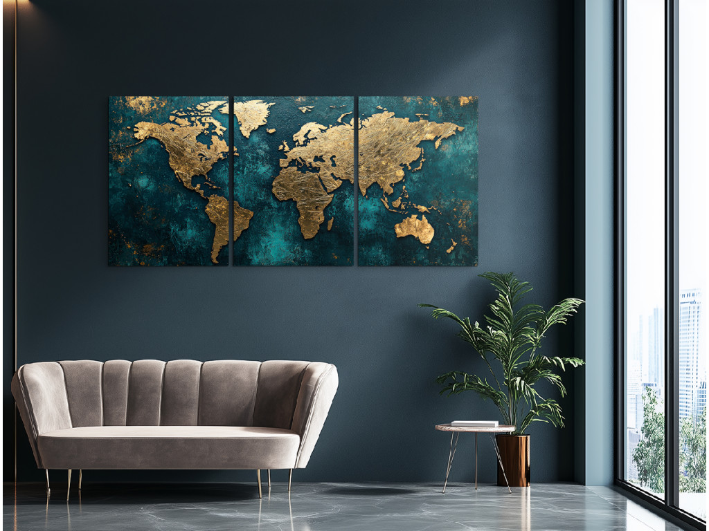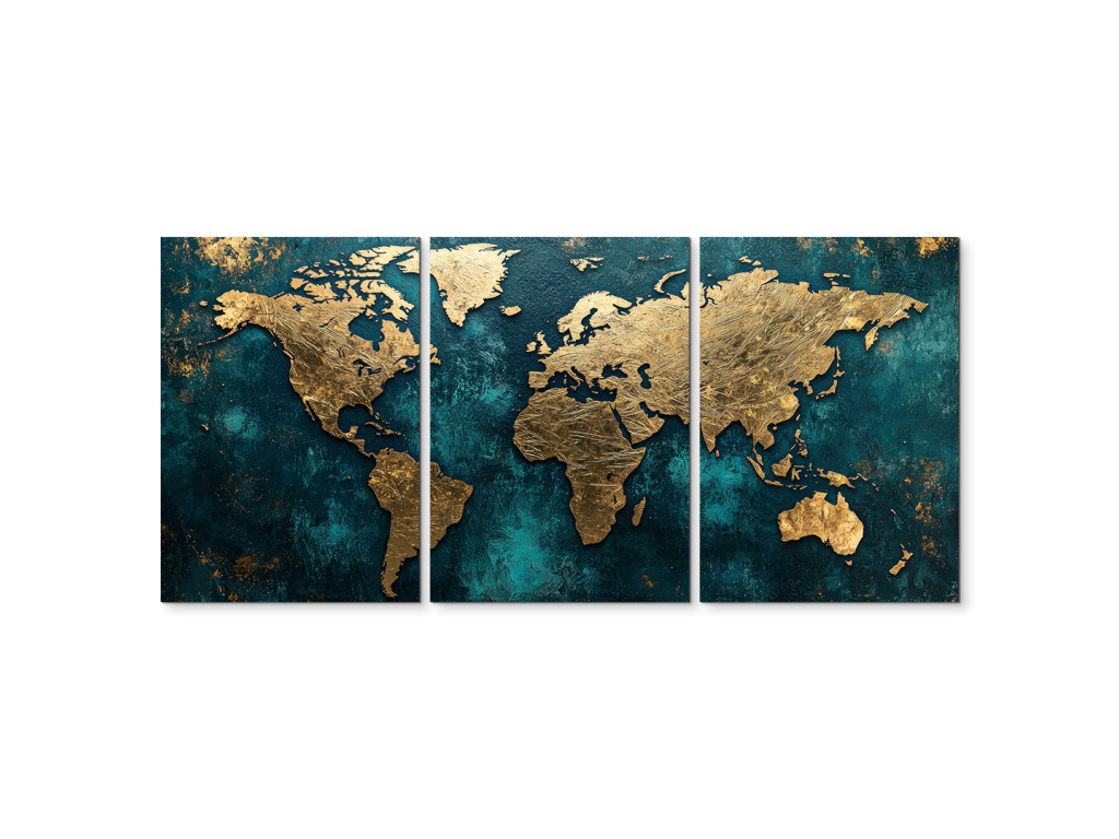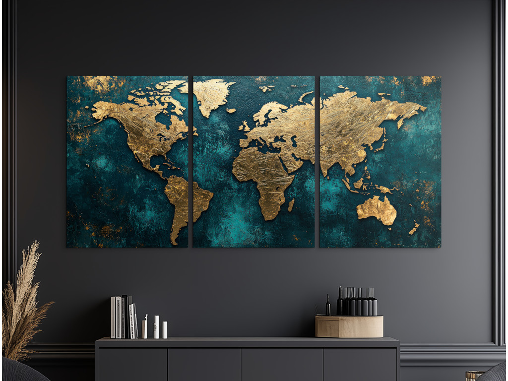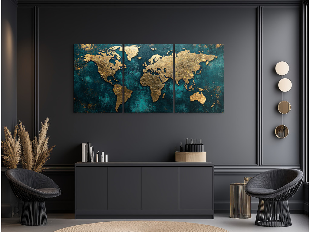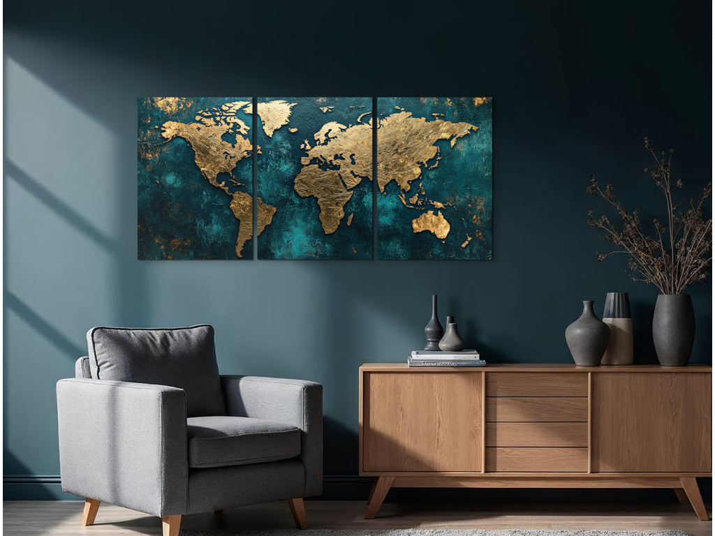 Dekoratívny trojdielny obraz na stenu s motívom mapy sveta kombinuje luxusné zlaté tóny s výraznou tyrkysovou farbou. Kontrast farieb vytvára moderný a elegantný vzhľad s nádychom exkluzivity. Vďaka UV tlači sa obraz hodí do moderného interiéru, kancelárie alebo reprezentatívneho priestoru, kde má pôsobiť ako dominantný dizajnový prvok.