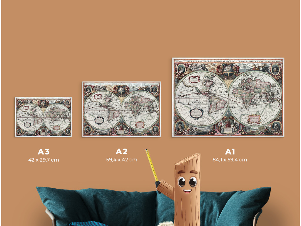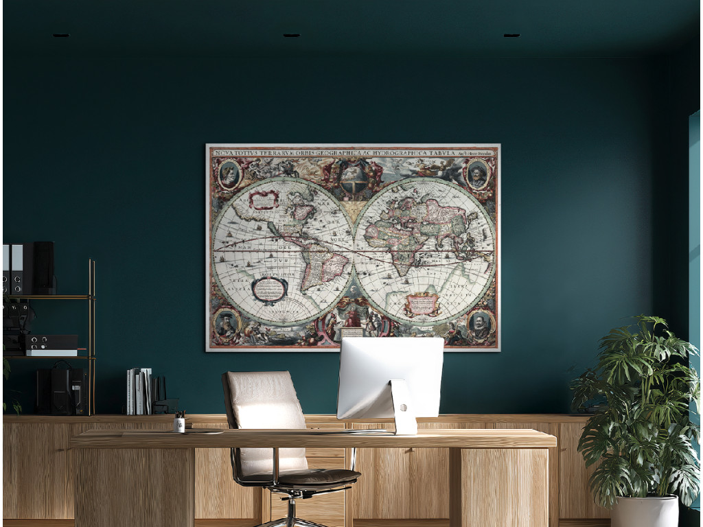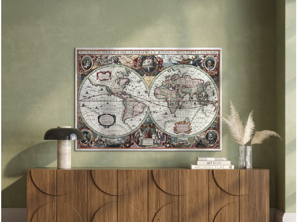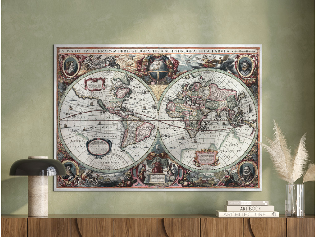 Reprodukcia barokovej mapy sveta od Henricusa Hondiusa z roku 1630 zobrazuje Zem v dvoch hemisférach, typických pre holandskú kartografiu Zlatého veku. Bohatá farebná výzdoba a ozdobné obrázky štyroch živlov dodávajú mape umelecký a historický charakter. Obraz sa hodí do pracovne, knižnice alebo reprezentatívneho interiéru pre milovníkov histórie a klasického dizajnu.