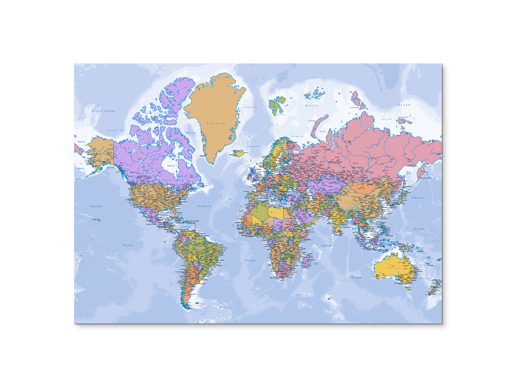 Prehľadná politická mapa sveta zobrazuje štáty, ich hranice a hlavné mestá. Jasné členenie a výrazné označenie geografických prvkov uľahčujú orientáciu. Vhodná ako nástenná, často laminovaná mapa do pracovne, školy alebo kancelárie.