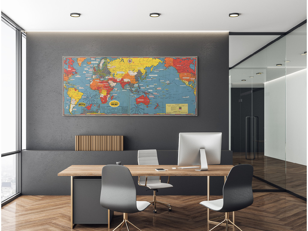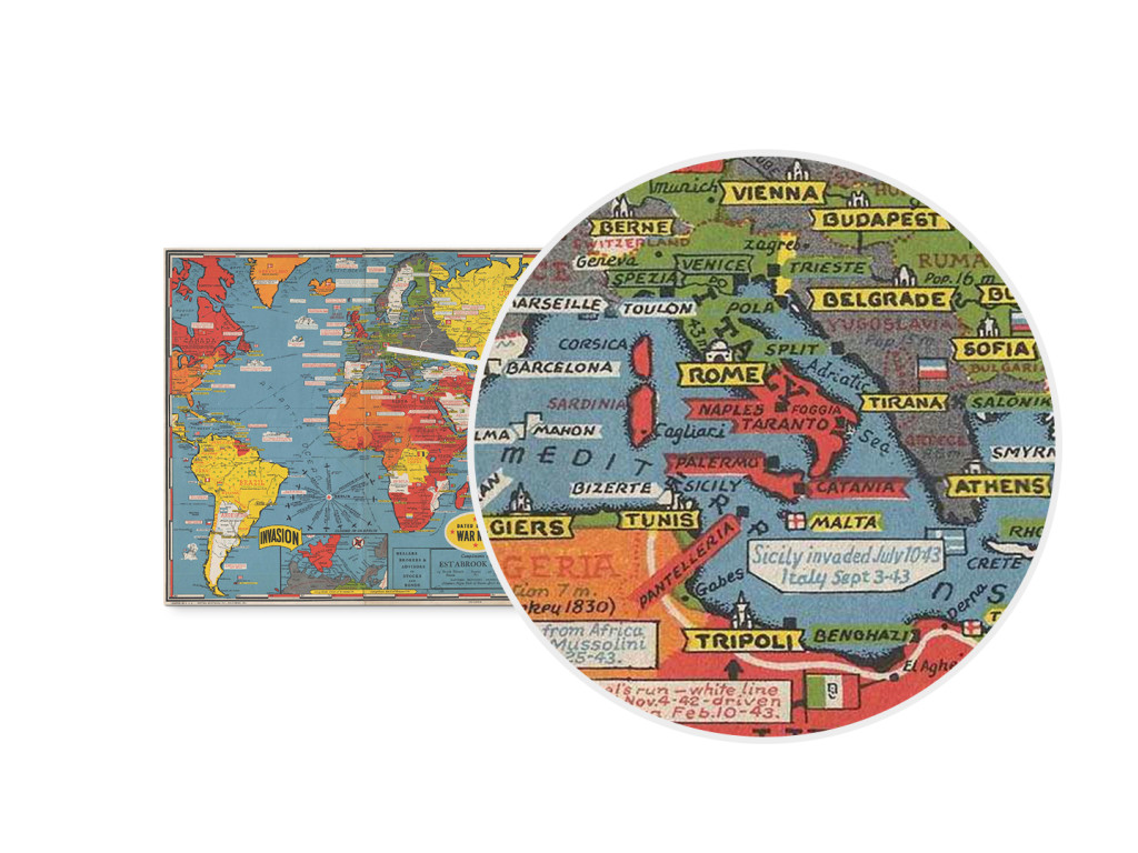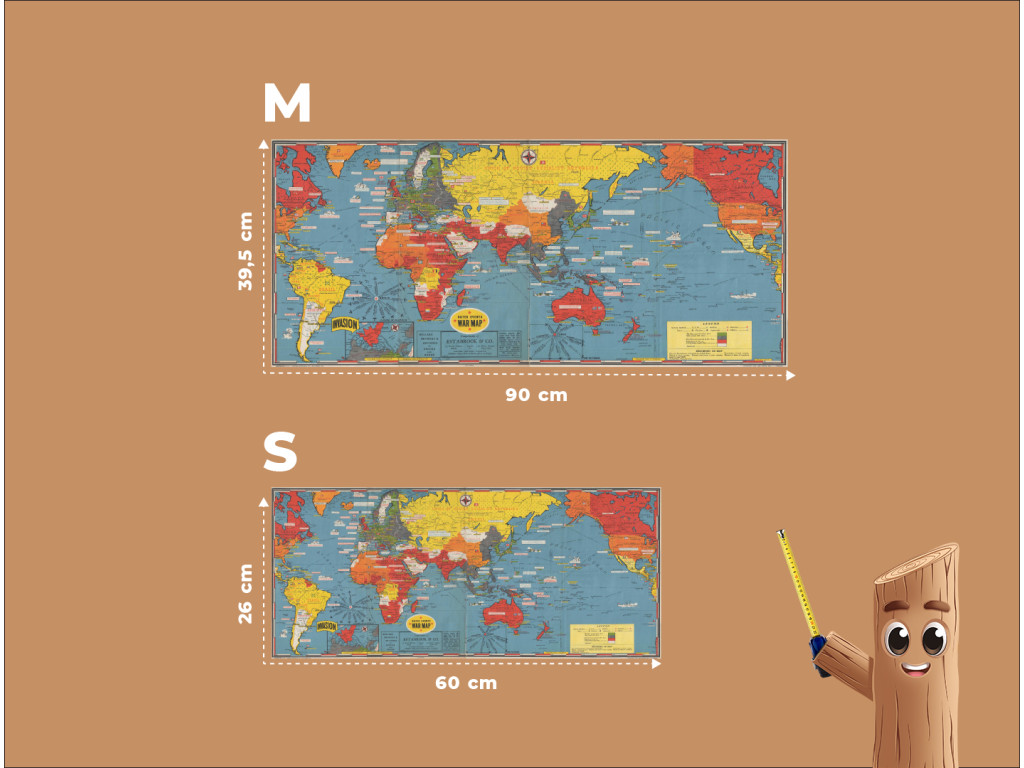 Originálna vojnová mapa z roku 1944 od Stanley Turner zachytáva kľúčové udalosti druhej svetovej vojny pomocou farebného kódovania území a vojenských postupov. Mapa známa ako Dated Events War Map je silným historickým dokumentom spojeným s obdobím D-Day. Ako dekorácia pôsobí autenticky a vzdelávaco a hodí sa do pracovne, kancelárie alebo interiéru so záujmom o históriu.