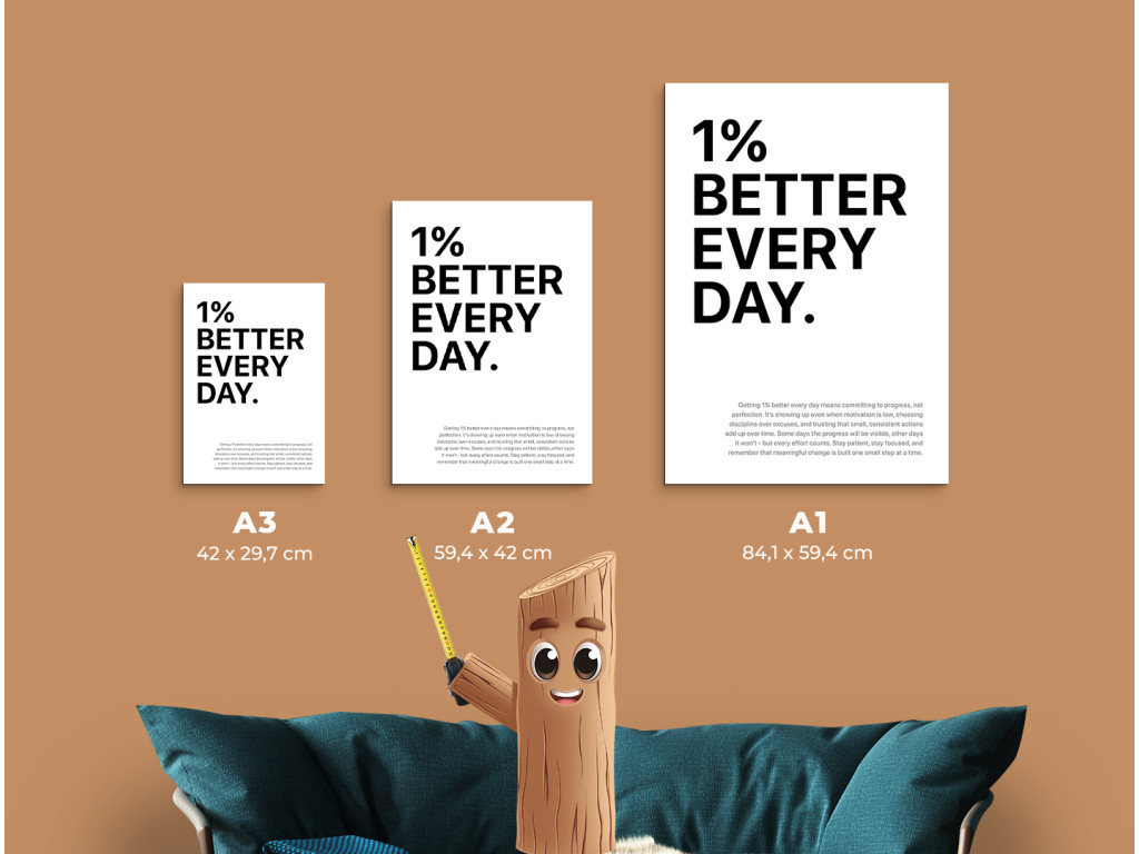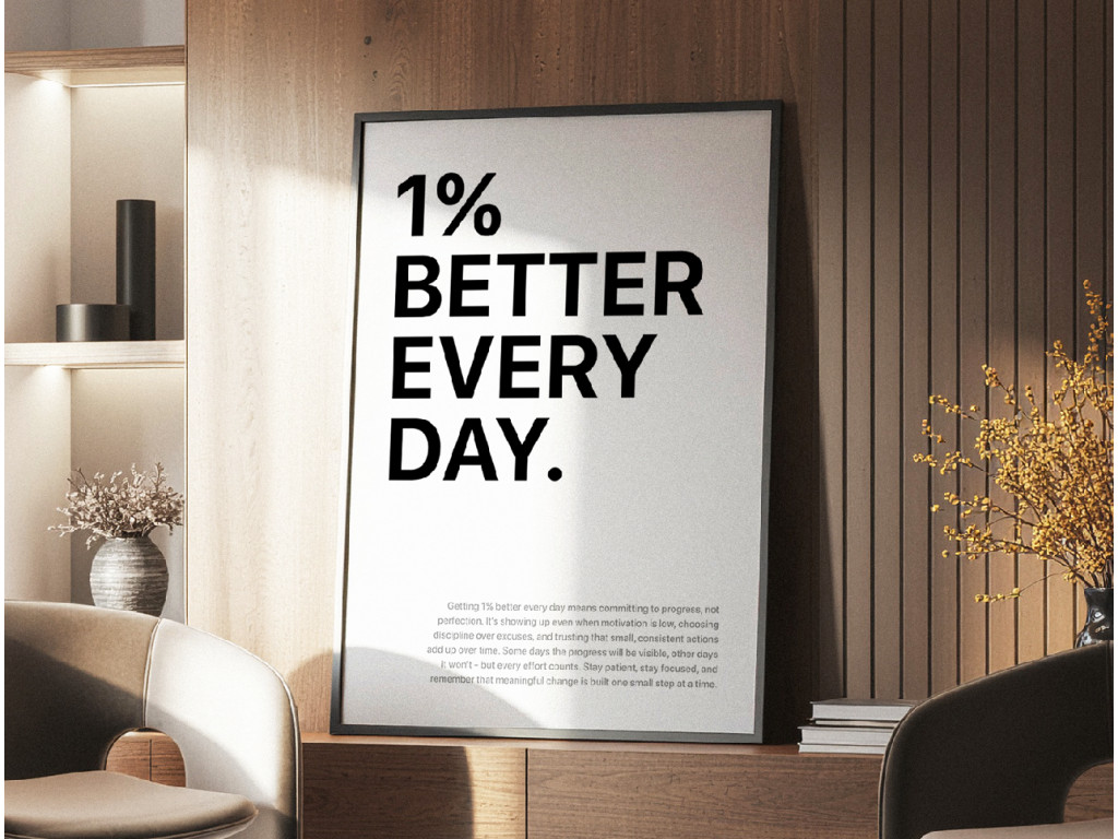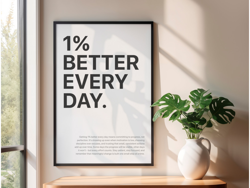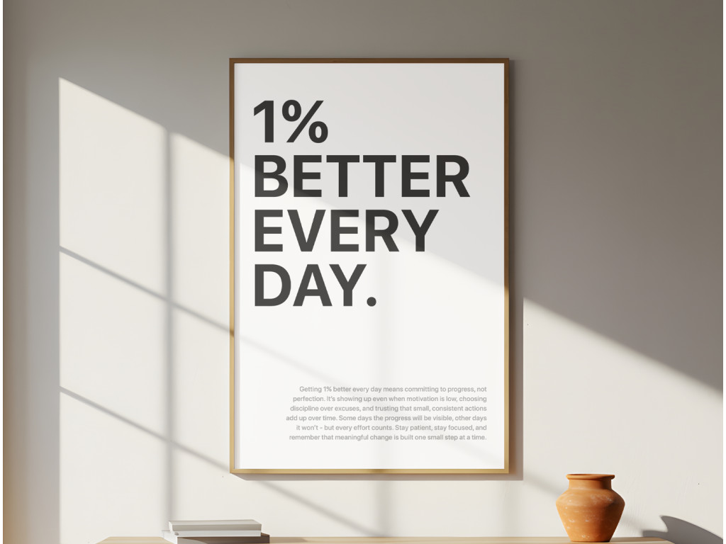 Motivačný obraz s myšlienkou „1 % Better Every Day“ (1 % lepší každý deň) zdôrazňuje silu malých, no konzistentných krokov smerom k zlepšeniu. Pripomína, aby sme sa zamerali na pokrok namiesto dokonalosti a budovali úspech postupne. V ľuďoch posilňuje disciplínu, trpezlivosť a vytrvalosť aj v dňoch, keď motivácia kolíše. Vďaka kvalitnej UV tlači pôsobí text čisto a výrazne, pričom obraz sa skvelo hodí do pracovne, kancelárie alebo fitness priestoru ako každodenná pripomienka rastu.
