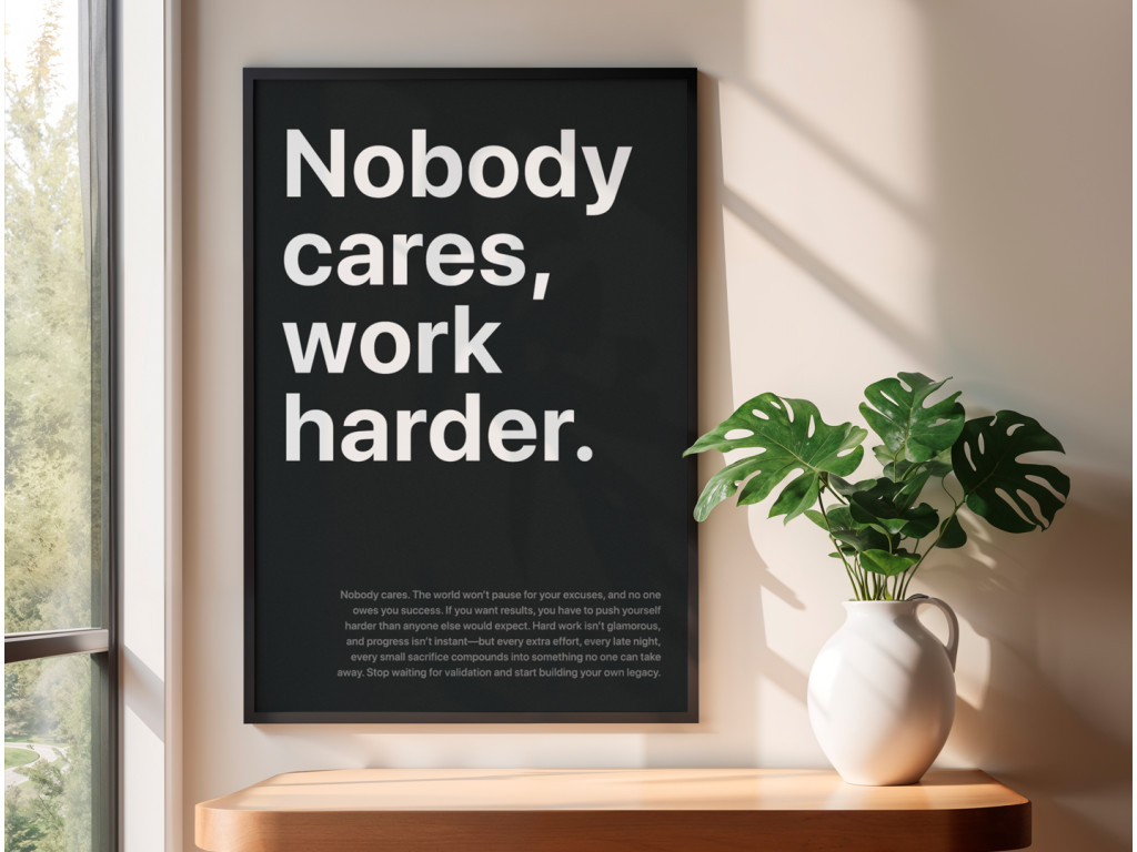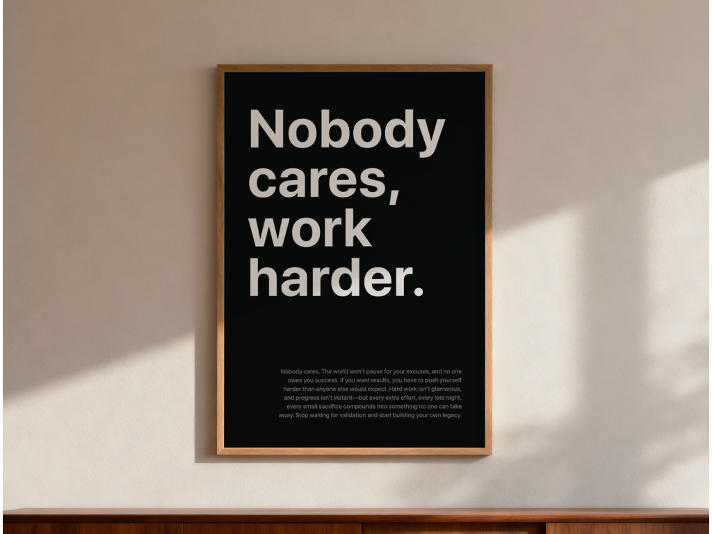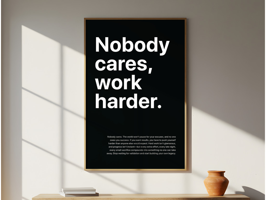 Motivačný obraz s výrokom „Nobody Cares, Work Harder“ (Nikoho to nezaujíma, pracuj tvrdšie) prináša priamu a nekompromisnú výzvu k zodpovednosti za vlastný úspech. Pripomína, že svet sa nezastaví kvôli výhovorkám a výsledky prichádzajú len cez úsilie, disciplínu a obetu. V ľuďoch prebúdza odolnosť, pracovnú morálku a odhodlanie prekonať vlastné limity bez čakania na uznanie. Vďaka kvalitnej UV tlači vynikne výraznosť textu a kontrast dizajnu, pričom obraz sa hodí do kancelárie, pracovne alebo fitness priestoru ako silná každodenná motivácia konať.