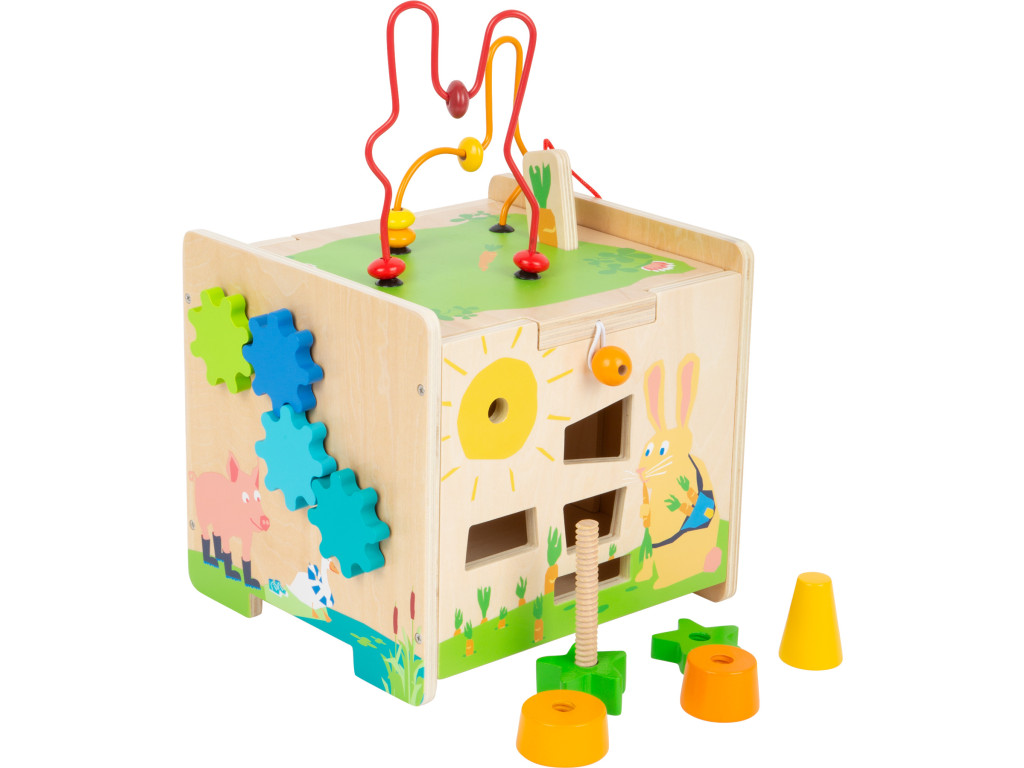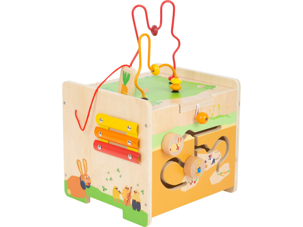 Drevená motorická hračka so zajačikom. Na každej strane sa nachádza iná aktivita pre deti, napríklad xylofón, vkladanie dielikov, otáčanie ozubených koliesok a iné. Motorickú kocku možno používať aj ako stoličku pre deti.