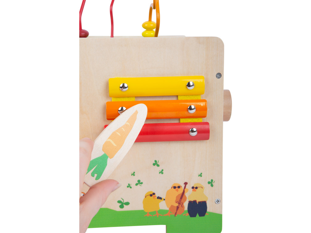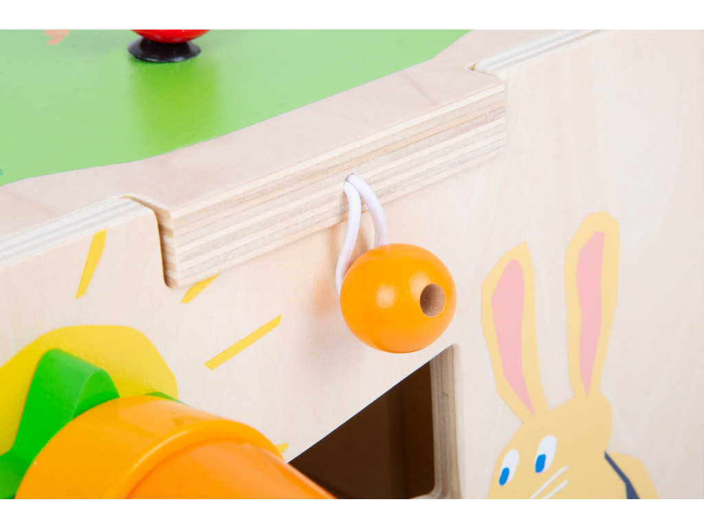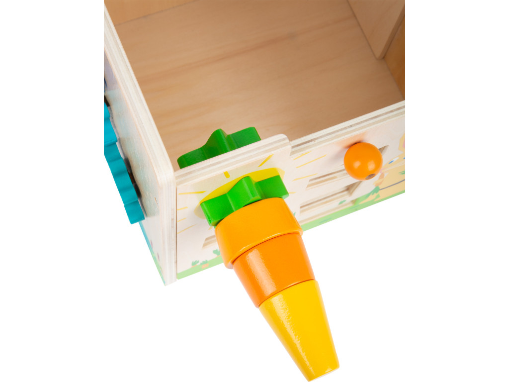 Korálkový labyrint v tvare zajačika! Deti sa môžu hrať na piatich stranách motorickej kocky, na každej strane nájdu inú aktivitu. Napríklad vkladanie dielikov, otáčanie ozubených koliesok, labyrint z korálkov, xylofón, je to perfektná hračka na precvičenie motoriky. Na jednej zo strán nájdete trčiace mrkvu, čo je skrutkovacia nasazovačka. Vrchnú stranu s labyrintom môžete odviazať a otočiť, aby ste mohli kocku skladovať bezpečne alebo z nej vytvorili stoličku pre deti. Drevená motorická kocka má krásnu ilustráciu zajačika a jeho kamarátov.
