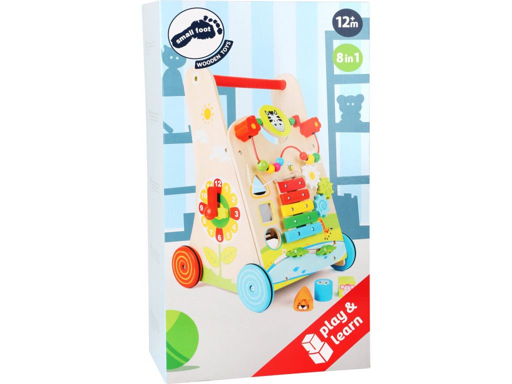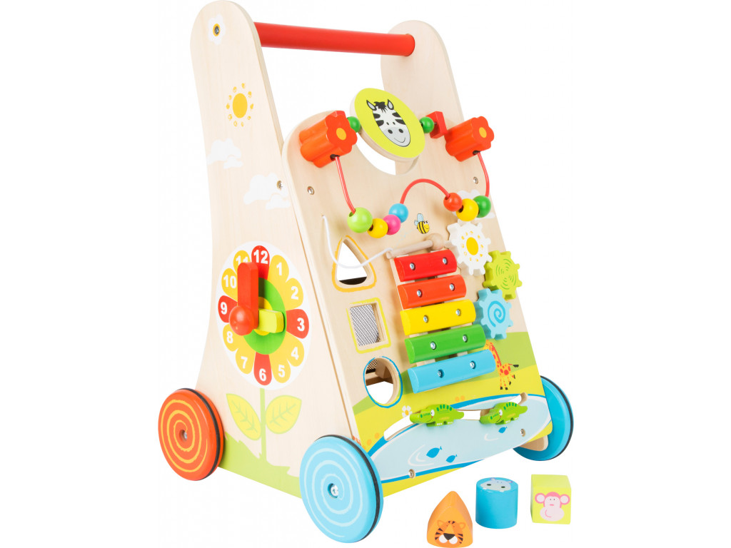 Stabilné detské chodítko poskytuje všetko, čo mladí prieskumníci potrebujú na objavovanie svojho sveta všetkými zmyslami. Pogumované kolesá zabraňujú pošmyknutiu a zabezpečujú tichý chod na rôznych podlahách. Obsahuje mnoho interaktívnych prvkov ako je xylofón s 5 klávesami, hodiny, labyrint, hlavolam, vkladačky s tvarovanými kockami. Dno chodítka možno použiť ako úložný priestor alebo na prevoz plyšákov