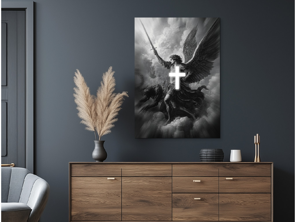 Obraz zobrazuje archanjela Michala, legendárneho nebeského bojovníka, ako stojí odhodlane s mečom, pripravený poraziť zlo. Jeho postoj, svätožiara a výrazná zbroj zosobňujú ochranu, spravodlivosť a božiu moc. Symbol víťazstva svetla nad temnotou, Michal je patrónom bojovníkov a štítom viery.