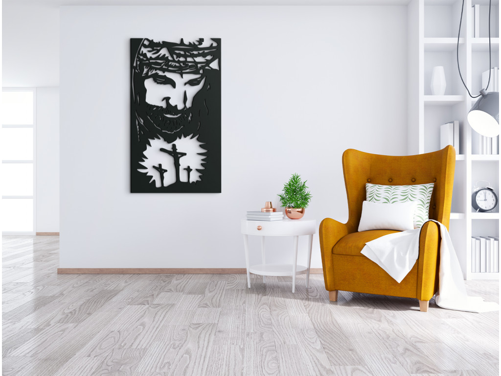 Obraz Ježiša s dvomi zločincami bude v interiéri stredobodom pozornosti. Ježiš pribitý na kríži, nad ním sa vyníma jeho tvár s tŕňovou korunou. Drevený obraz Ježiša Krista v modernom prevedení je vhodný na stenu do spálne, obývačky aj chodby.
