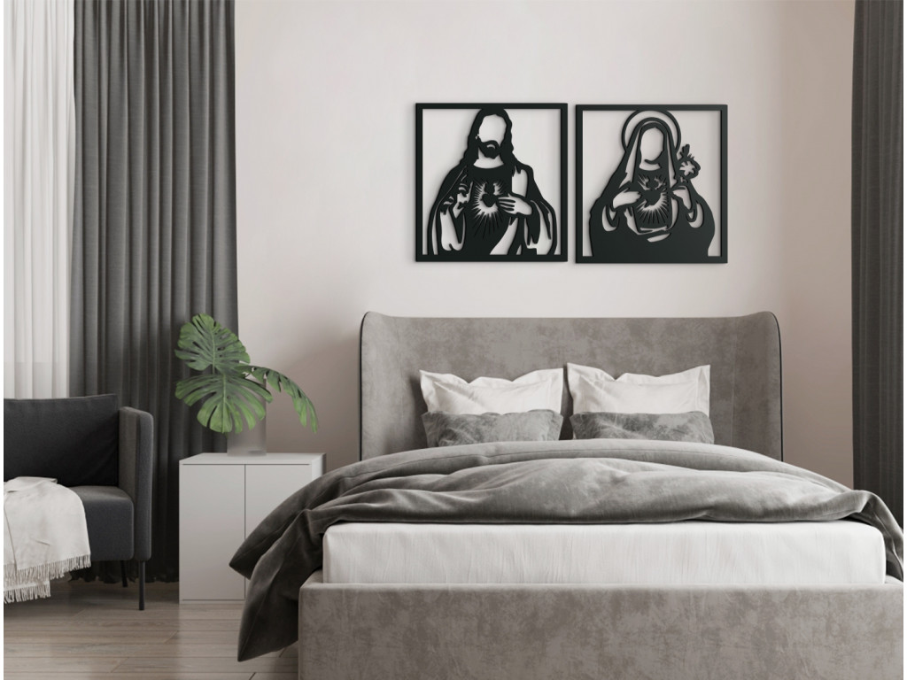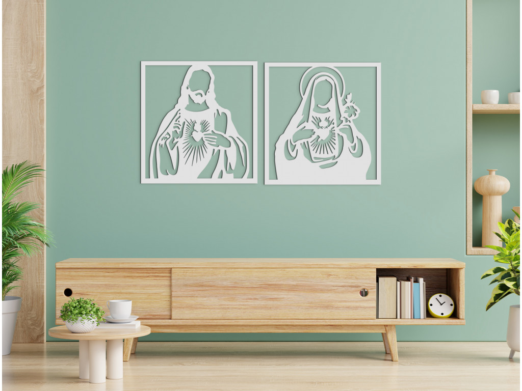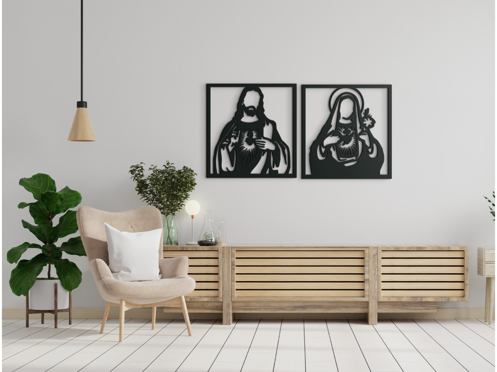 Obraz Srdce Ježišovo a srdce Márie je doplnkom vhodným do klasických priestorov. Drevený obraz Ježiša a Márie je vhodný na stenu do spálne, obývačky aj chodby. Nálepka vnesie do interiéru pokojnú atmosféru.