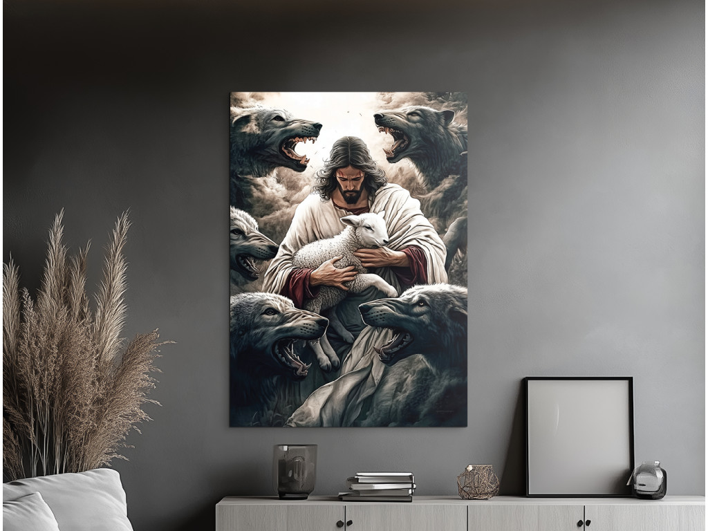 Tento dramatický obraz zobrazuje Ježiša Krista, ktorý drží ovečku v náručí, zatiaľ čo okolo neho obkľučujú dravé vlky. Scéna symbolizuje Kristovu ochranu, starostlivosť a odvahu, keď ako Dobrý pastier neustúpi ani tvárou v tvár hrozbe. Obraz je silným vizuálnym stvárnením viery, obety a Božej ochrany.