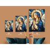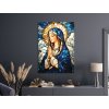Obraz zobrazuje Pannu Máriu v ikonickom modrom plášti so zlatou svätožiarou, vyobrazenú v štýle mozaiky. Detaily vytvorené z farebných úlomkov vytvárajú posvätnú atmosféru a zvýrazňujú jej pokojnú a ochrannú prítomnosť.