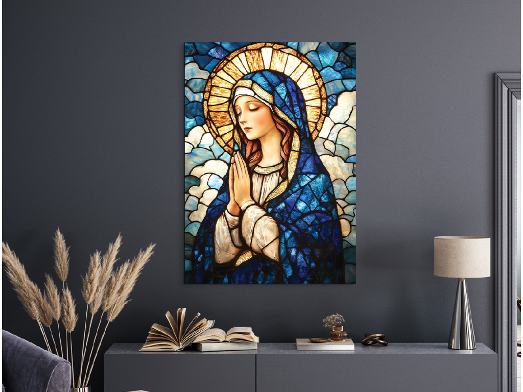 Obraz zobrazuje Pannu Máriu v ikonickom modrom plášti so zlatou svätožiarou, vyobrazenú v štýle mozaiky. Detaily vytvorené z farebných úlomkov vytvárajú posvätnú atmosféru a zvýrazňujú jej pokojnú a ochrannú prítomnosť.