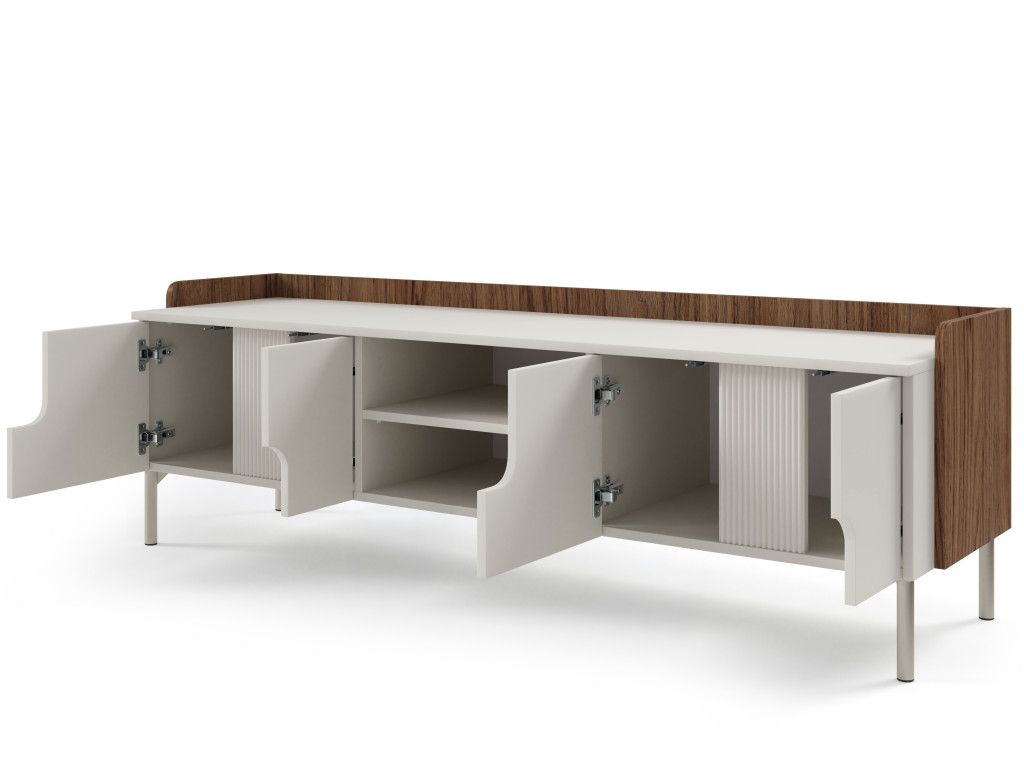 TV stolík Positano PO10 v prevedení orech alba / kašmírová béžová prináša výrazný dizajn v kompaktnejšom formáte. Kontrast tmavšieho orecha a svetlej béžovej dodáva interiéru moderný a štýlový charakter. Typické tvarované dvierka s vrúbkovanou lištou vytvárajú originálny vizuálny prvok. Stredová otvorená polica poskytuje praktický priestor pre elektroniku. Bezúchytkové otváranie push to open (Tip-On) zachováva čistý a elegantný vzhľad.
