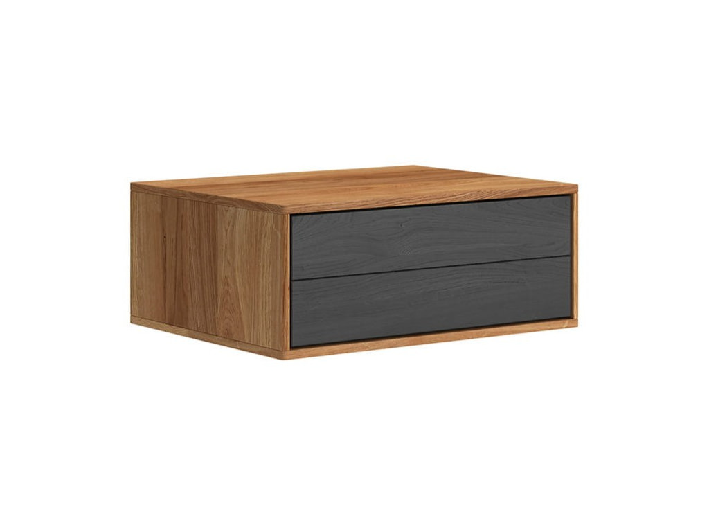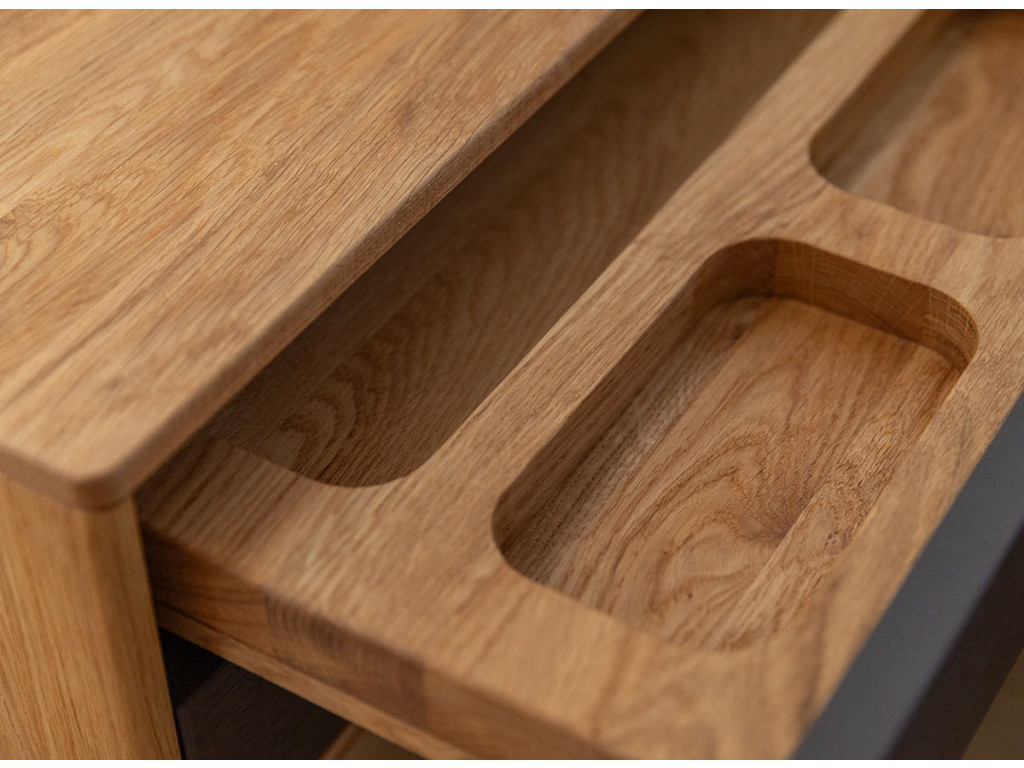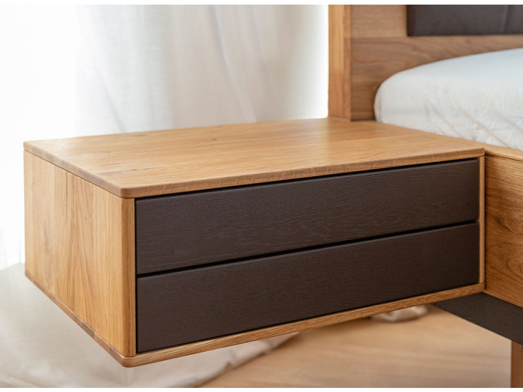 Závesný nočný stolík Sora 2S s dvoma grafitovými zásuvkami predstavuje vyvážené spojenie prírodného masívneho dubu a moderného kontrastného akcentu. Teplý dubový korpus s viditeľnou kresbou dreva dopĺňajú dve zásuvky v matnej grafitovej farbe, ktoré dodávajú stolíku súčasný charakter bez straty útulnosti. Stolík je vyrobený výhradne z masívneho dubového dreva a ošetrený prírodným olejom Hesse, ktorý chráni povrch a zvýrazňuje jeho prirodzenú štruktúru. Grafitové čelá sú ošetrené ekologickou matnou farbou, príjemnou na dotyk a odolnou voči každodennému používaniu. Závesné prevedenie uvoľňuje podlahu, zjednodušuje upratovanie a umožňuje zavesenie stolíka v ľubovoľnej výške. Dve zásuvky s pojazdmi Hettich s tlmičom zabezpečujú tichý chod a prehľadnú organizáciu vecí pri posteli.