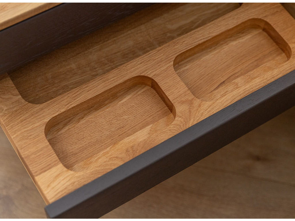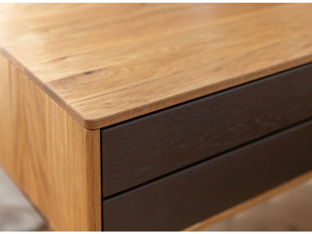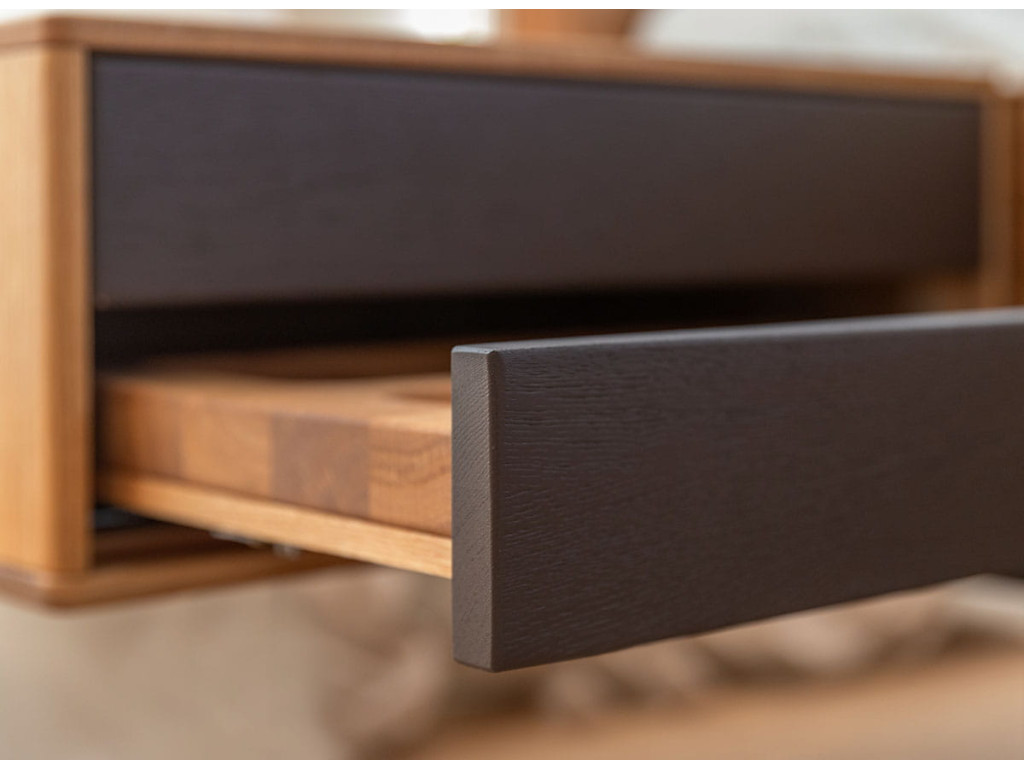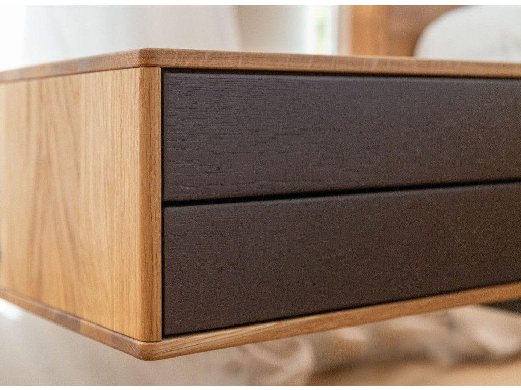 Závesný nočný stolík Sora 2S s dvoma zásuvkami je zosobnením čistej funkčnosti a prirodzenej estetiky masívneho dubu. Celý stolík je vyhotovený v jednotnom prírodnom dubovom odtieni bez kontrastných akcentov či dekorácií, vďaka čomu pôsobí pokojne, harmonicky a nadčasovo. Je vyrobený výlučne z masívneho dubového dreva a ošetrený prírodným olejom Hesse, ktorý chráni povrch, zvýrazňuje kresbu dreva a zachováva jeho matný, teplý vzhľad. Závesná konštrukcia šetrí podlahový priestor, uľahčuje upratovanie a dodáva interiéru vizuálnu ľahkosť. Stolík je vybavený dvoma priestrannými zásuvkami s kvalitnými pojazdmi Hettich s tlmičom, ktoré sa otvárajú hladko, ticho a bez úchytiek. Vďaka možnosti zavesenia v ľubovoľnej výške je ideálny do spálne, ale aj do kancelárie, hosťovskej izby či predsiene.