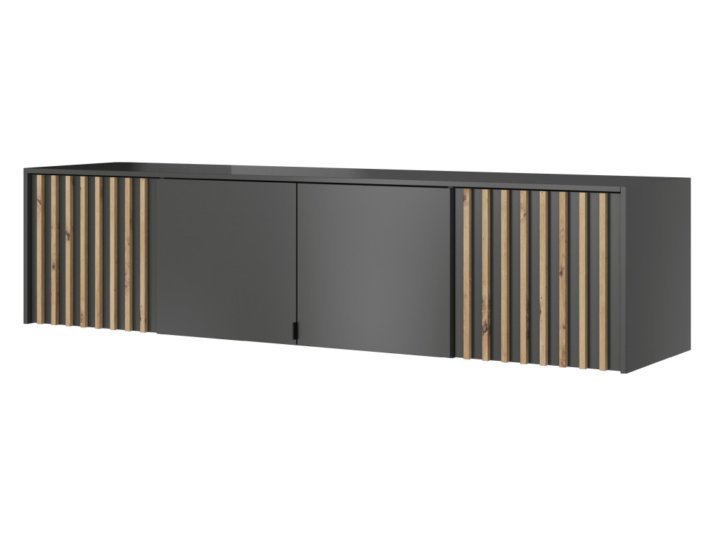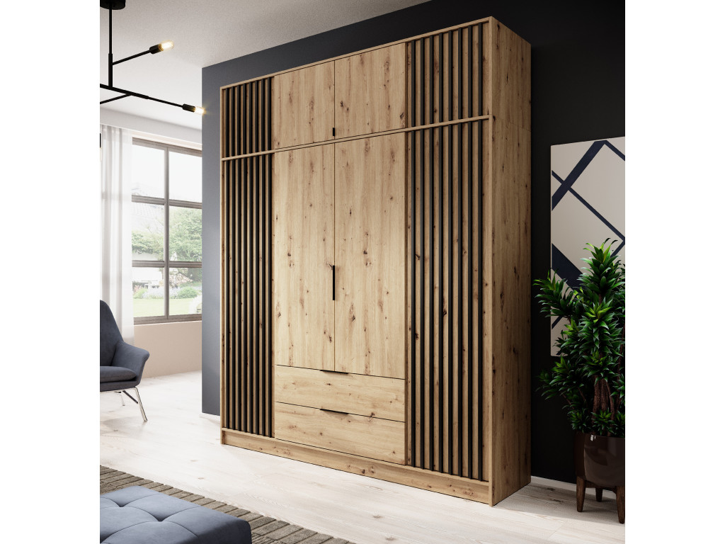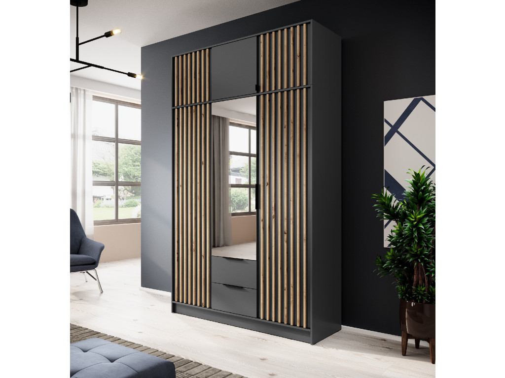 Nadstavec Nelly 4D v kombinácii tmavého grafitového korpusu a ozdobných lamiel v dekore dub artisan elegantne dopĺňa štvordverovú skriňu z rovnakej kolekcie. Vďaka dokonale zladenému dizajnu nadstavca a skrine pôsobí celá zostava jednotne a kompaktným dojmom. Nadstavec je vybavený klasickými pántovými dvierkami a ponúka ideálny priestor na uloženie menej často používaných alebo sezónnych vecí – napríklad posteľnej bielizne, kufrov či dekorácií. Vizuálne výrazný kontrast medzi tmavým grafitom a prírodným dubom v podobe lamiel dodáva celej zostave moderný a nadčasový vzhľad.