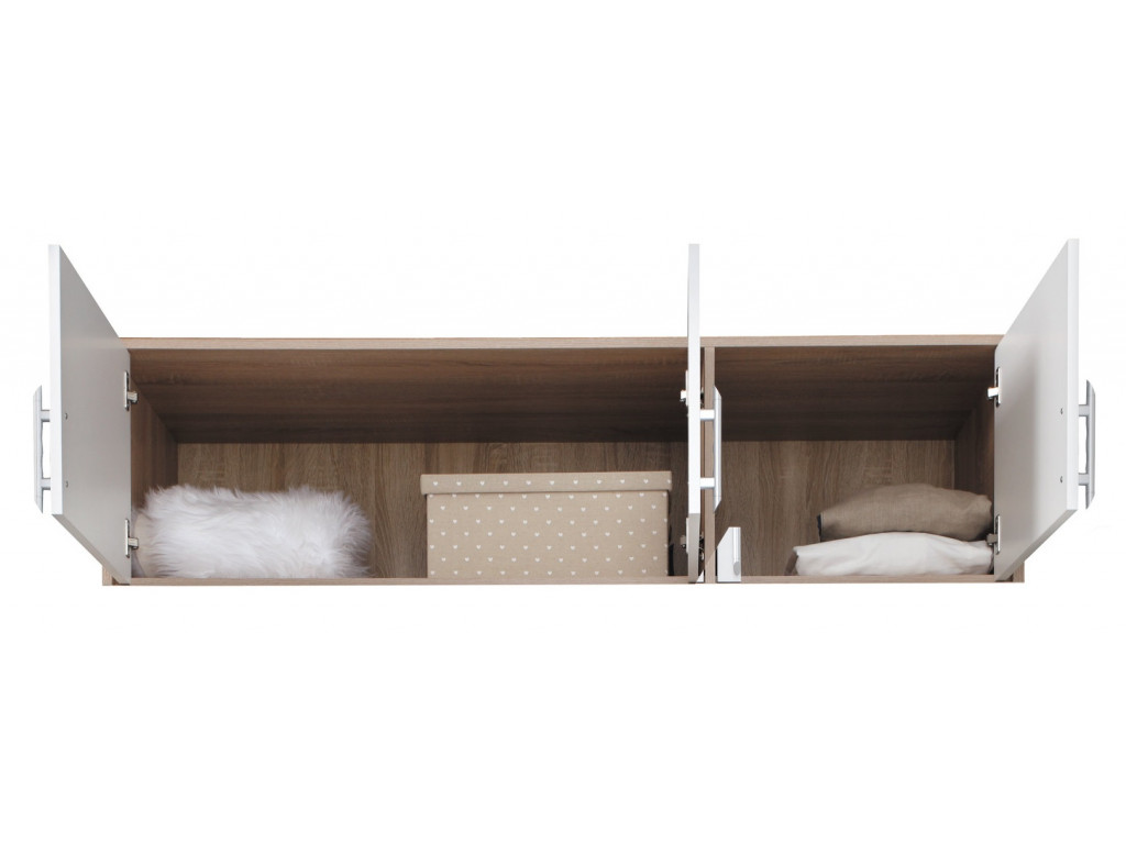 Nadstavec na skriňu je vyrobený z laminovanej dosky, ľahko sa udržiava i čistí. Dostupný vo vyhotovení biela - dub sonoma.