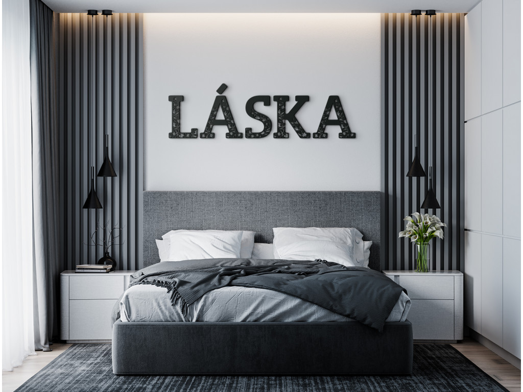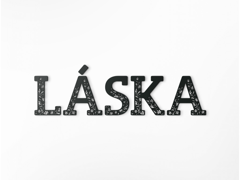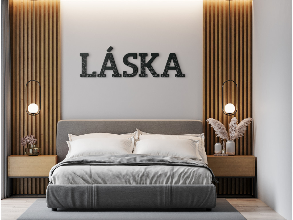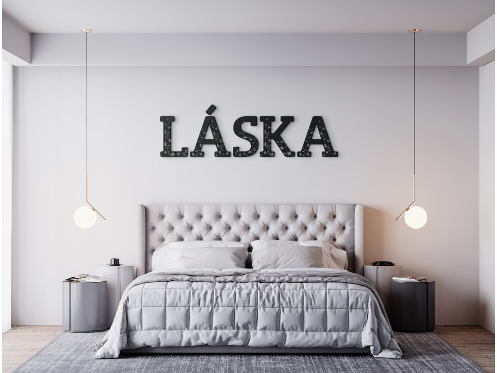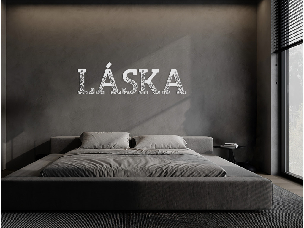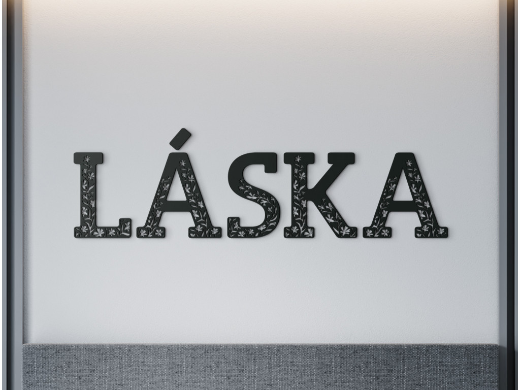 Nápis Láska bude obľúbenou dekoráciou v dome či byte. Jednotlivé písmená zdobia detailné výrezy drobných kvetín a popínavých listov. Romantický dizajn je preto tiež vhodný ako originálny darček pre milovanú osobu.