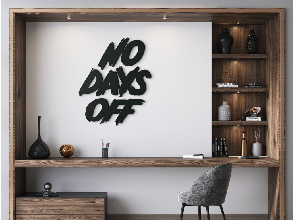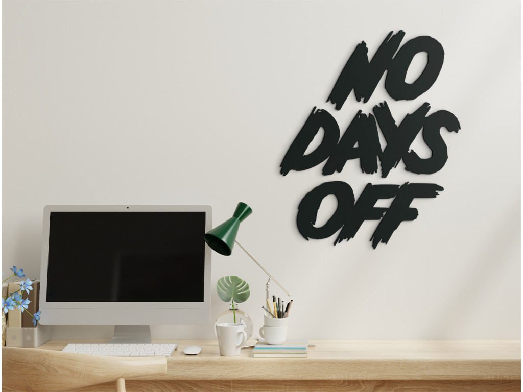 Drevená nálepka na stenu No days off je humorným a štýlovým vyjadrením toho, že máte práce naozaj nad hlavu. Písmená sú znázornené veľmi moderne, vyzerajú ako namaľované širokým štetcom. Umiestnite ju napríklad nad písací stôl v pracovni, alebo hoci aj do posilňovne, kde ju môže každý obdivovať.
