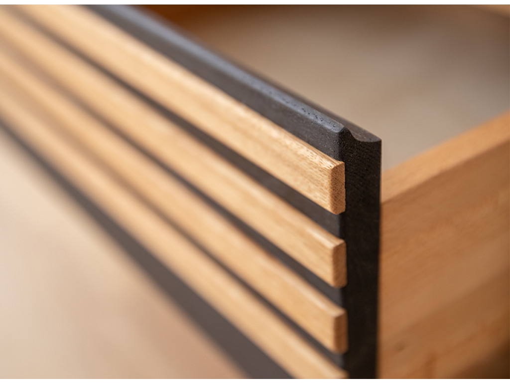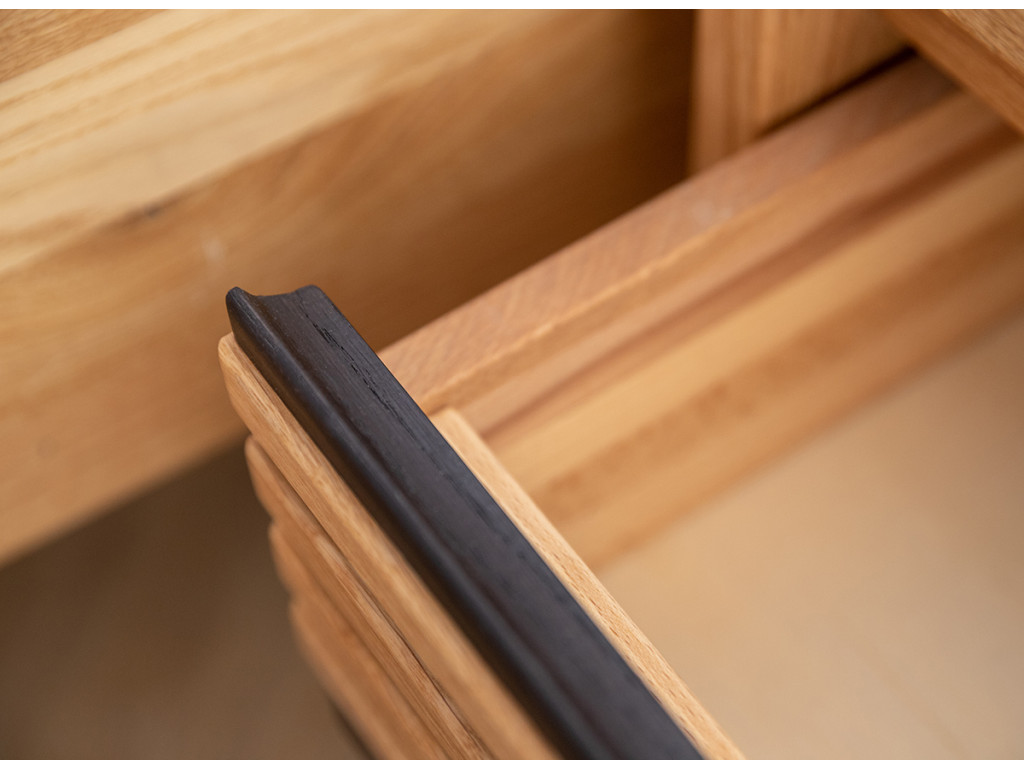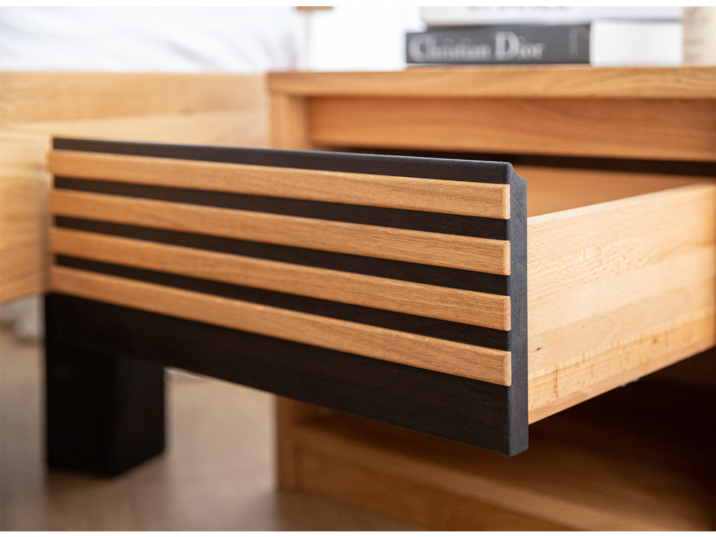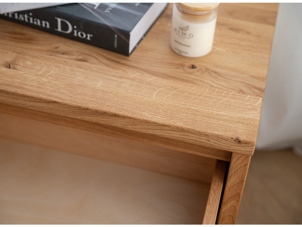 Dubový nočný stolík so zásuvkou Ravello v sebe umne kombinuje prirodzenú krásu a praktickosť. Dolná časť stolíka ponúka veľkorysý priestor vhodný na uloženie rozličných nevyhnutností, kníh na čítanie v posteli alebo kozmetiky. V hornej časti sa nachádza zásuvka s výsuvmi Hettich, vybavená tichým zatváraním, čo zvyšuje pohodlie pri používaní.