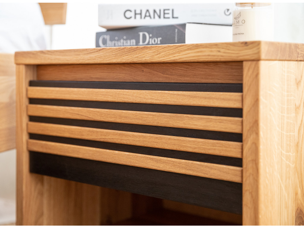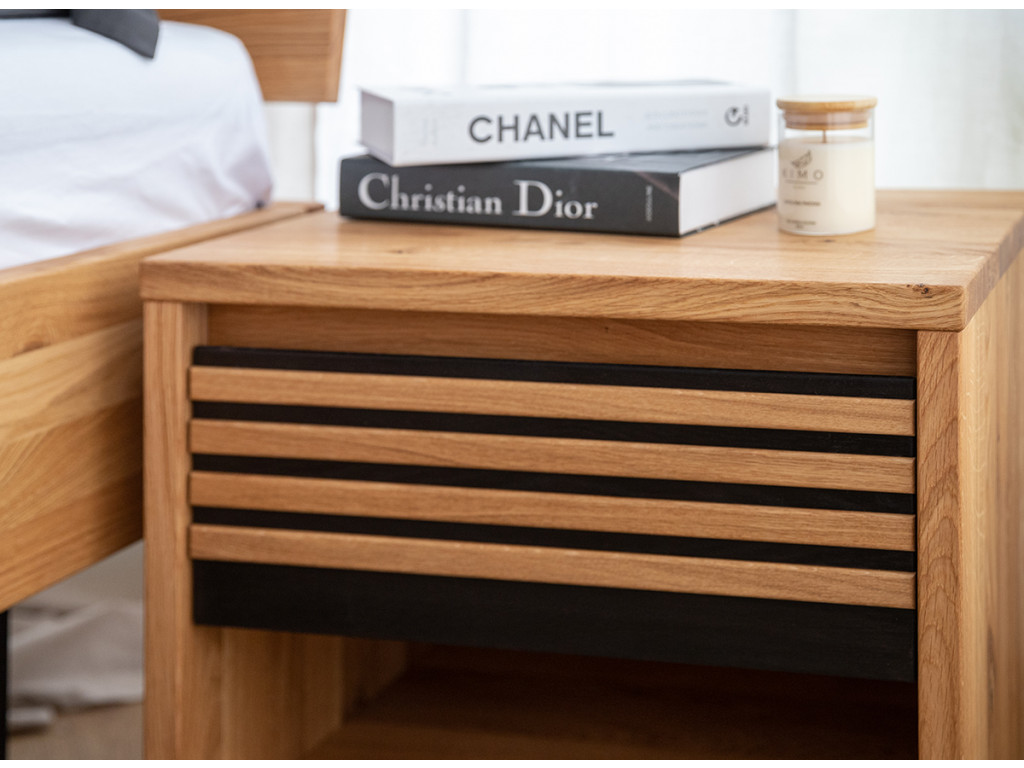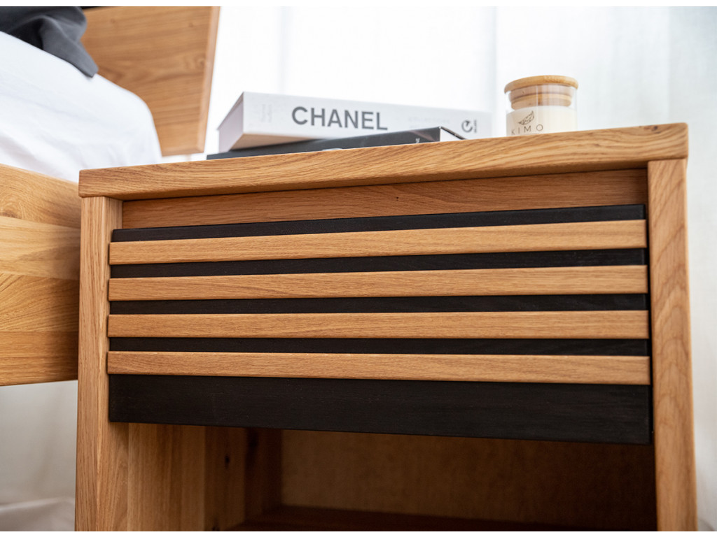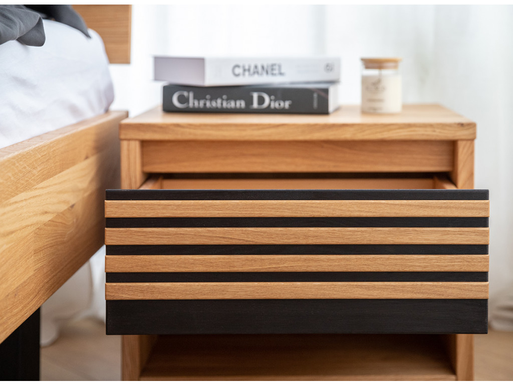Štýlový nočný stolík so zásuvkou zaujme svojím teplým zlatistým odtieňom dubového dreva, ktorý sa skvele snúbi s čiernymi akcentmi vo forme tenkých horizontálnych lamiel. Mimoriadne praktická zásuvka umiestnená tesne pod pracovnou doskou ponúka priestor na drobnosti potrebné pred spaním.