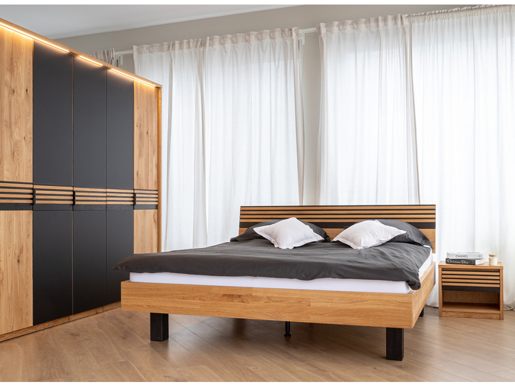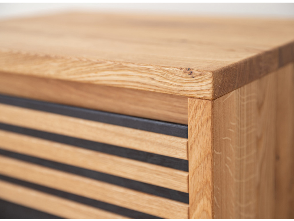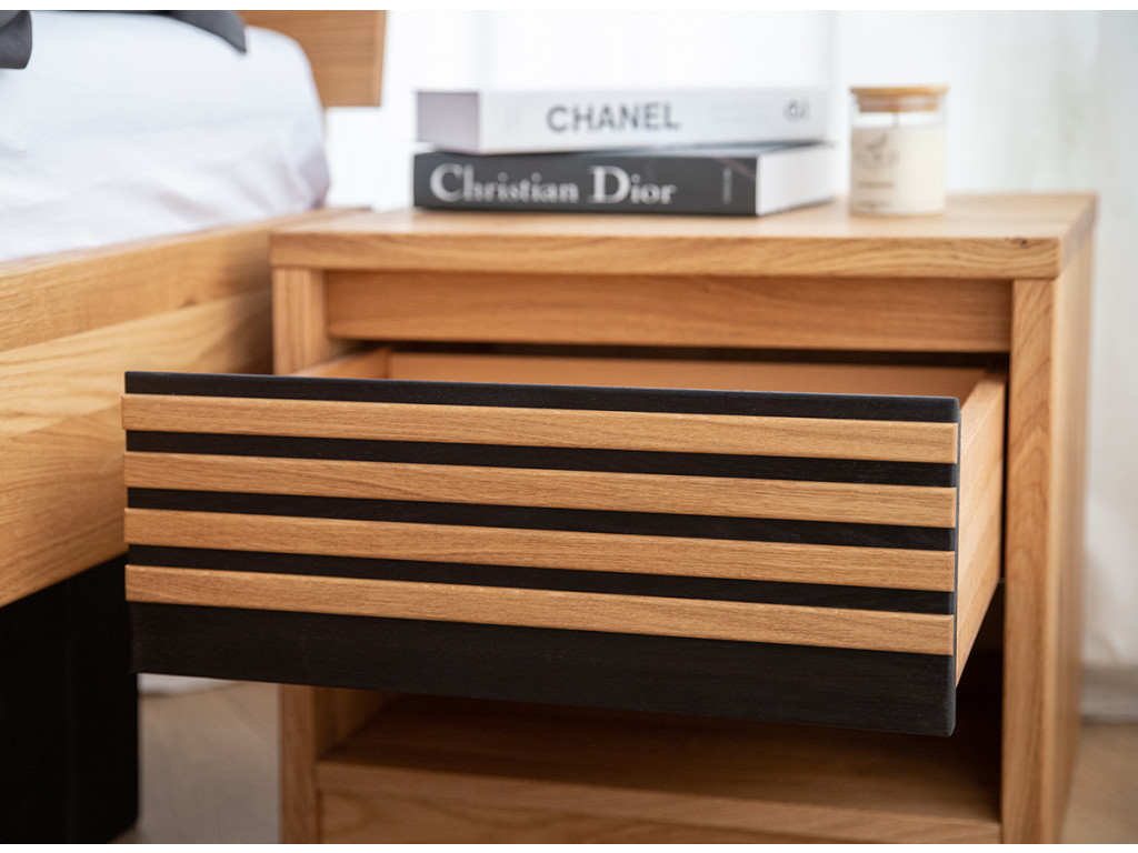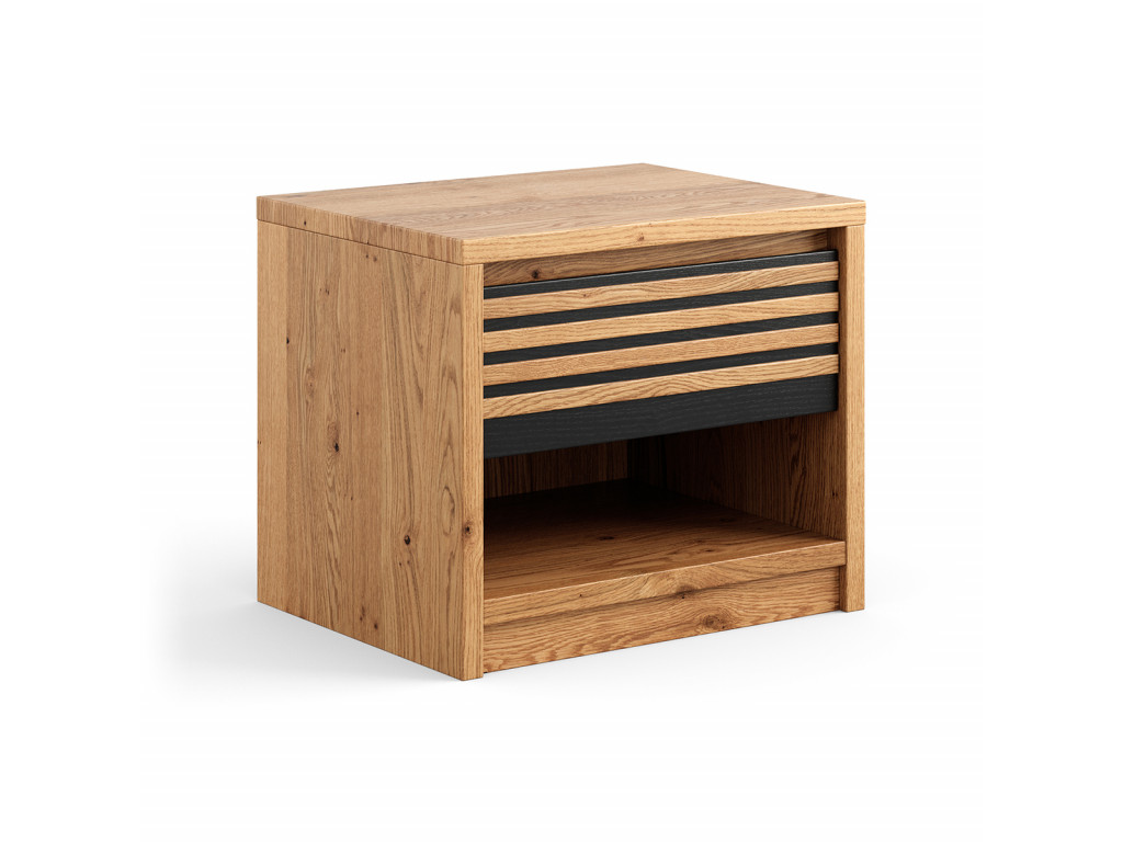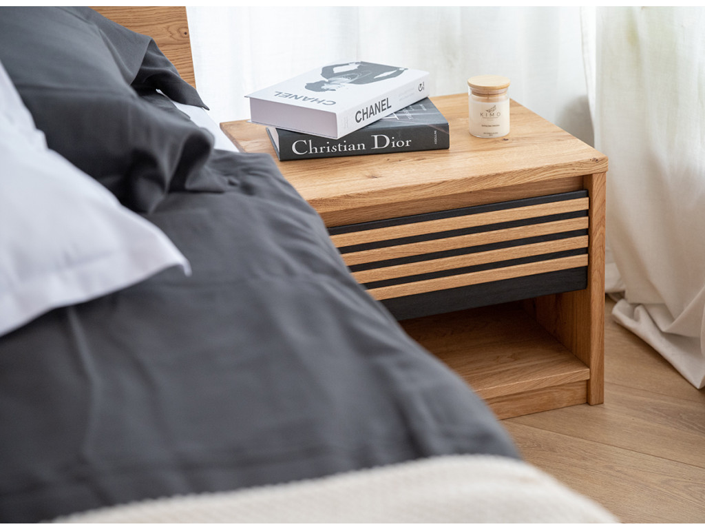Štýlový nočný stolík so zásuvkou zaujme svojím teplým zlatistým odtieňom dubového dreva, ktorý sa skvele snúbi s čiernymi akcentmi vo forme tenkých horizontálnych lamiel. Mimoriadne praktická zásuvka umiestnená tesne pod pracovnou doskou ponúka priestor na drobnosti potrebné pred spaním.