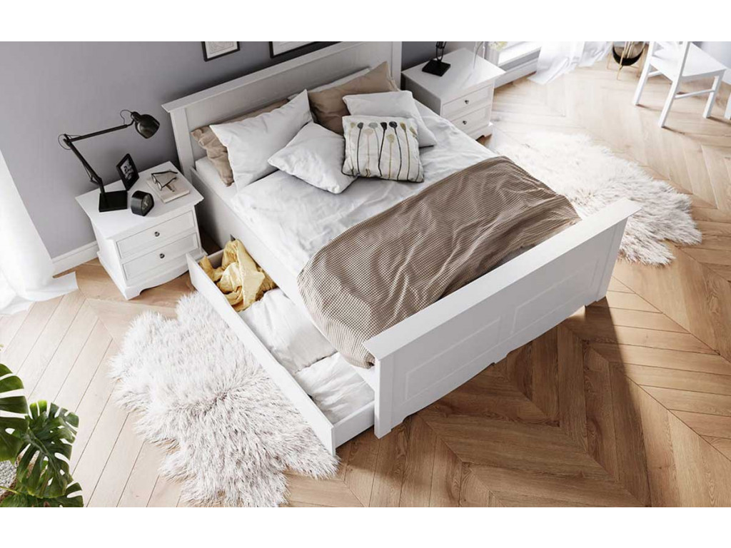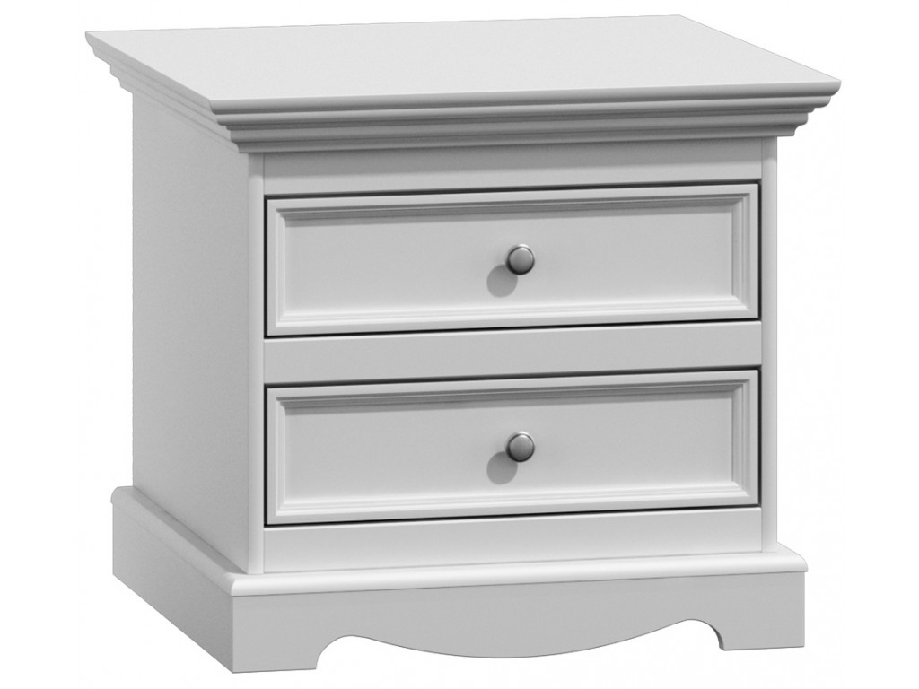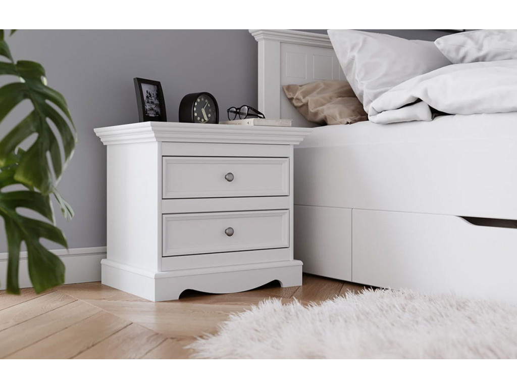 Nočný stolík má 2 zásuvky na vodidlách. Vďaka bežcom Quadro sa zásuvka jemne zatvára bez vytvárania nepríjemného hluku. Vložíte do nej drobnosti, ktoré potrebujete mať pri sebe bezprostredne po prebudení alebo pred zaspaním. Nočný stolík má vyrezávaný vrch. Ozdobný podstavec a estetické drážky na zásuvkách dodávajú nábytku provensálsku atmosféru. Zásuvky sú vybavené kovovými úchytkami (striebornými), ktoré ladia s celkom. Spodok zásuviek je vyrobený z HDF dosky.