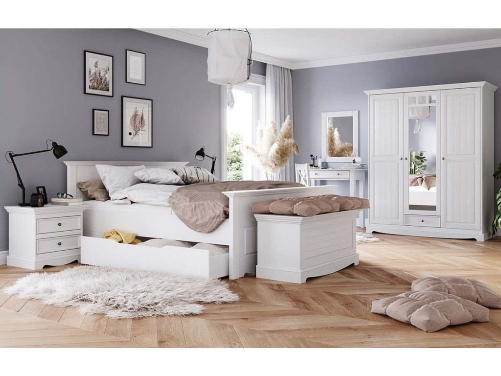 Klasický nočný stolík do spálne bol natretý bielou farbou na vodnej báze s krytím 85 %. Toto ošetrenie umožnilo zdôrazniť prirodzenú štruktúru dreva. Vďaka teplému odtieňu je drevený nočný stolík vhodný prakticky do každej spálne bez ohľadu na nábytok, ktorý tam stojí.