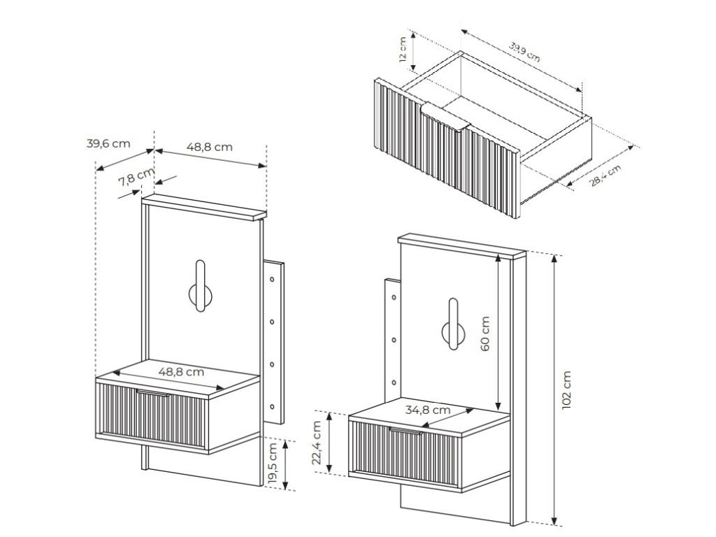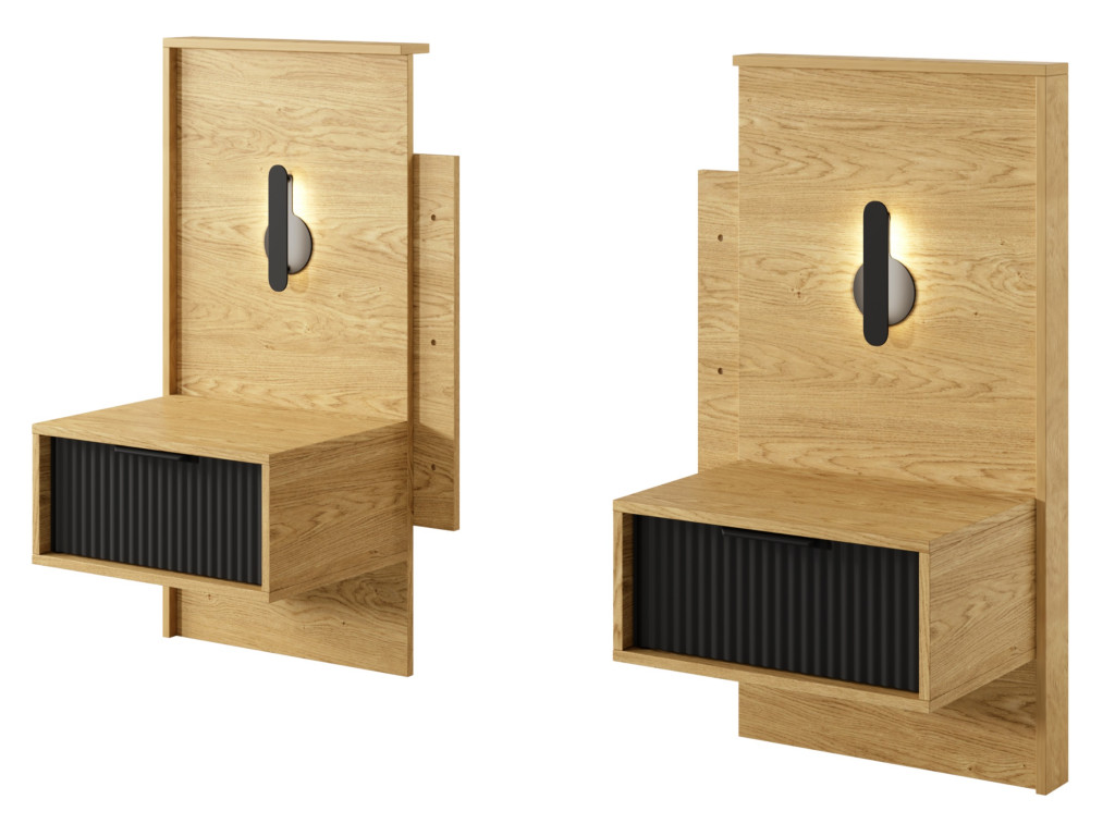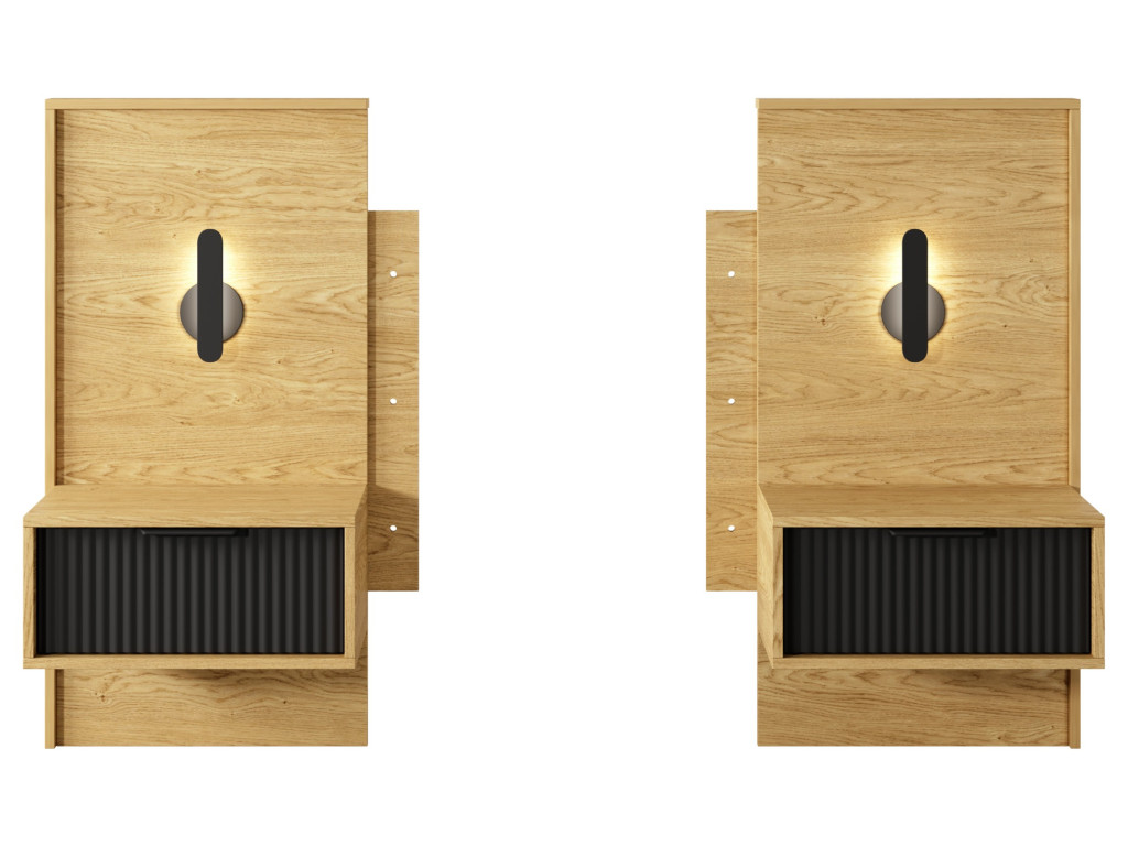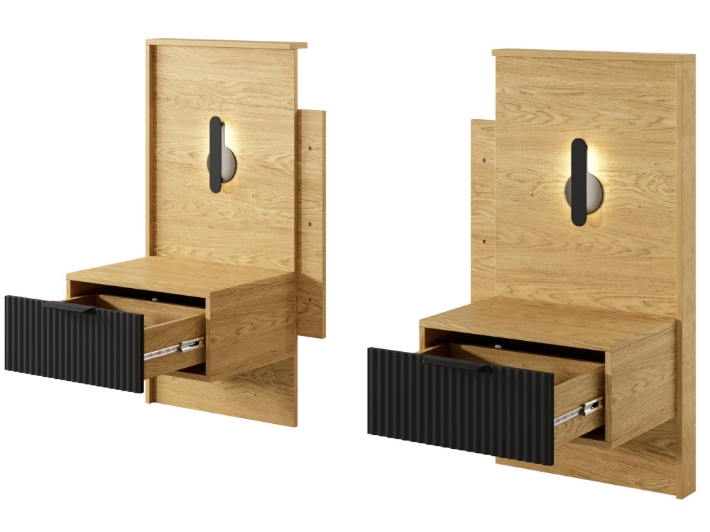 Každý stolík disponuje jednou zásuvkou na odkladanie drobností a integrovaným LED osvetlením v cene, ktoré jemne osvetlí priestor po bokoch postele a dodá spálni príjemnú atmosféru. Spojenie prírodného dreva a čiernych detailov zaručuje, že stolíky budú nielen funkčné, ale aj esteticky výrazným prvkom vašej spálne.