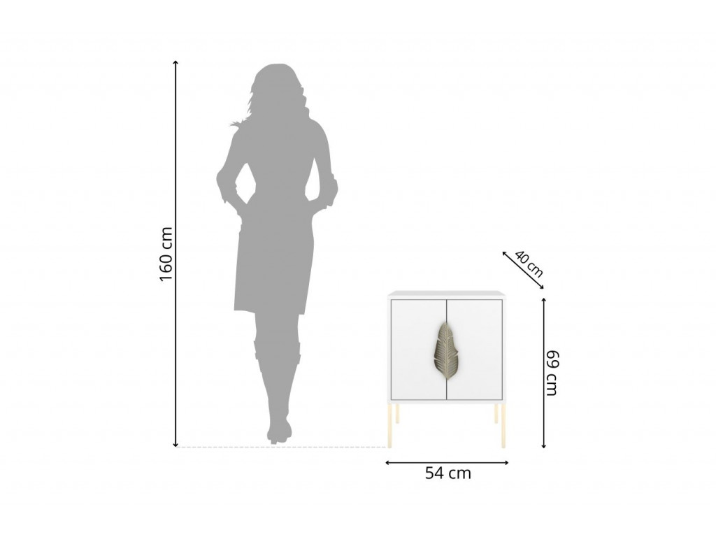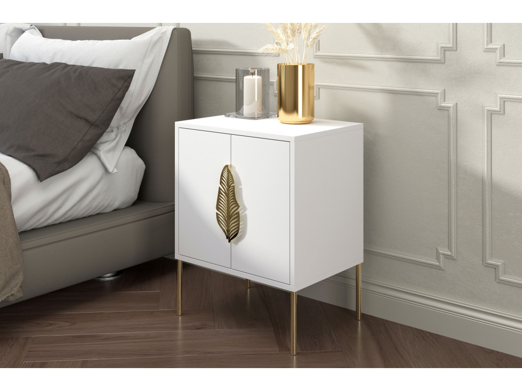 Biely nočný stolík je určený predovšetkým do spálne, ktorá zaujme jednoduchou formou odetou do štýlových doplnkov. Krásu nábytku zvýrazňuje veľká zlatá úchytka v tvare listu, dokonale ladiaca s nohami rovnakej farby.