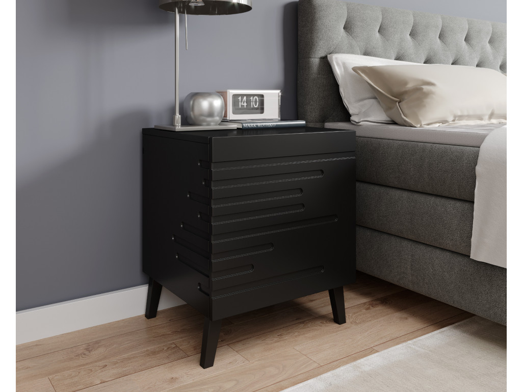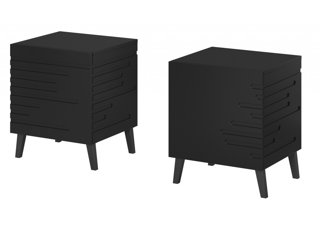 S praktickým nočným stolíkom Nova čiernej farby s hlbokou zásuvkou budete mať vždy všetko pekne poruke nielen vy, ale aj váš partner. Súprava totiž obsahuje dva kusy nočných stolíkov. Poteší aj nápaditý dizajn s výraznými ryhami na predných čelách, ktorý dodáva nábytku dekoratívny charakter.