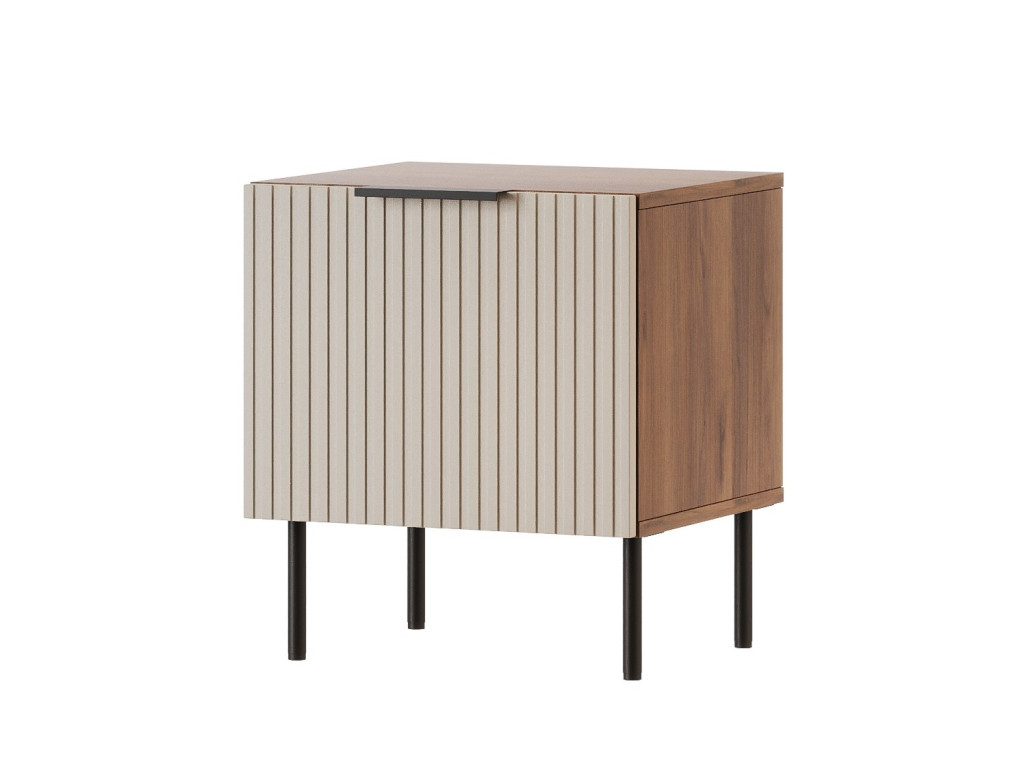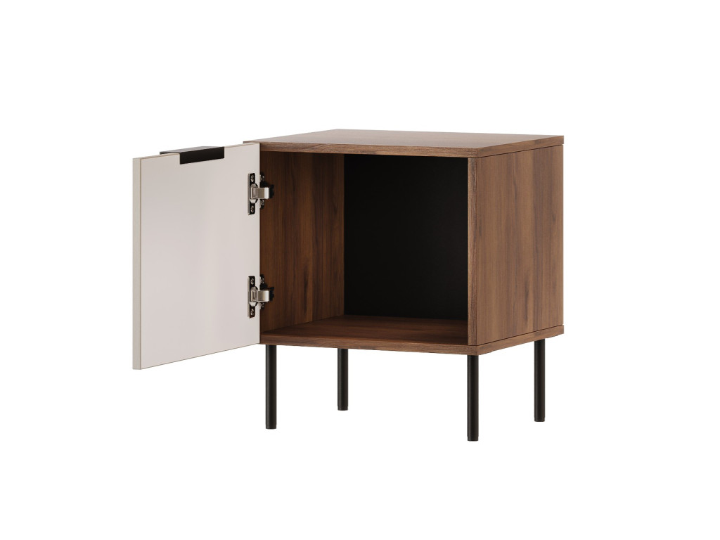 Nočný stolík Almera 7 v elegantnej kombinácii béžová / orech je štýlovým a praktickým doplnkom spálne. Stolík má bočné otváranie dvierok s vnútorným úložným priestorom a je dodávaný v balení po 2 kusoch. Moderný dizajn dopĺňajú čierne kovové úchytky a kovové nožičky s výškou 15 cm, ktoré dodávajú nábytku ľahkosť a nadčasový vzhľad.