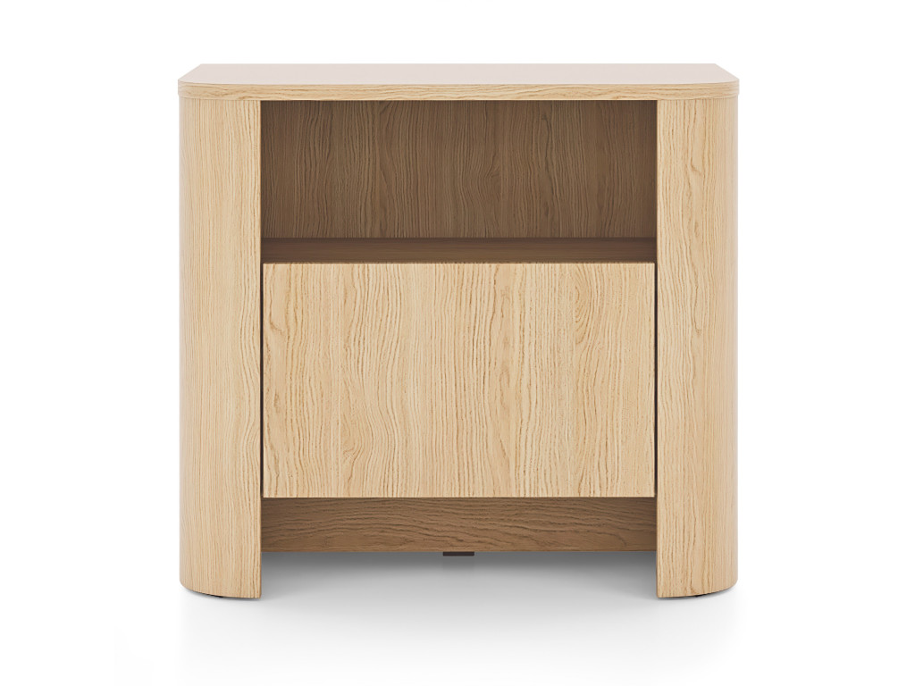 Nočný stolík Bari – dub vincenza kombinuje zásuvku a policu v modernom dizajne so zaoblenými hranami a soklovou základňou. Ideálny na odkladanie kníh aj drobností.