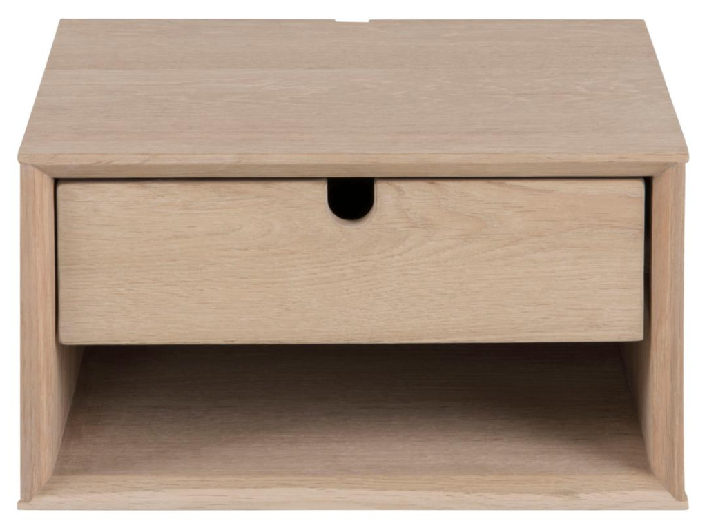 Stolík Century B v bielenom dube je kompaktný, praktický a elegantný doplnok do spálne. Obsahuje zásuvku aj otvorený priestor na knihy či dekorácie. Upevnenie na stenu šetrí miesto.