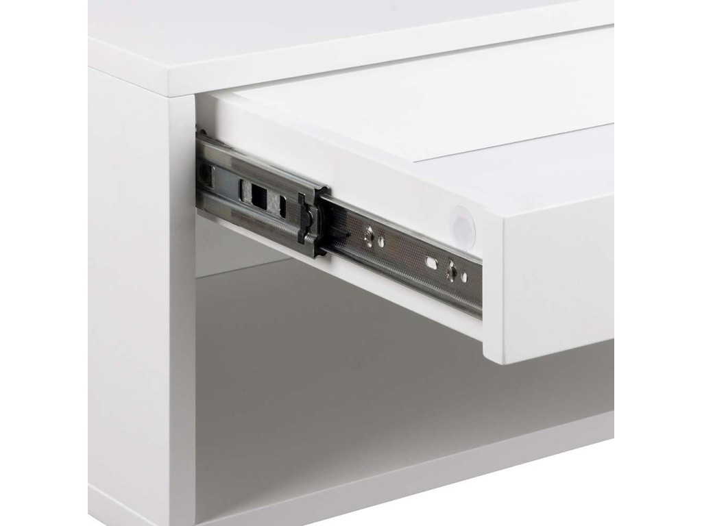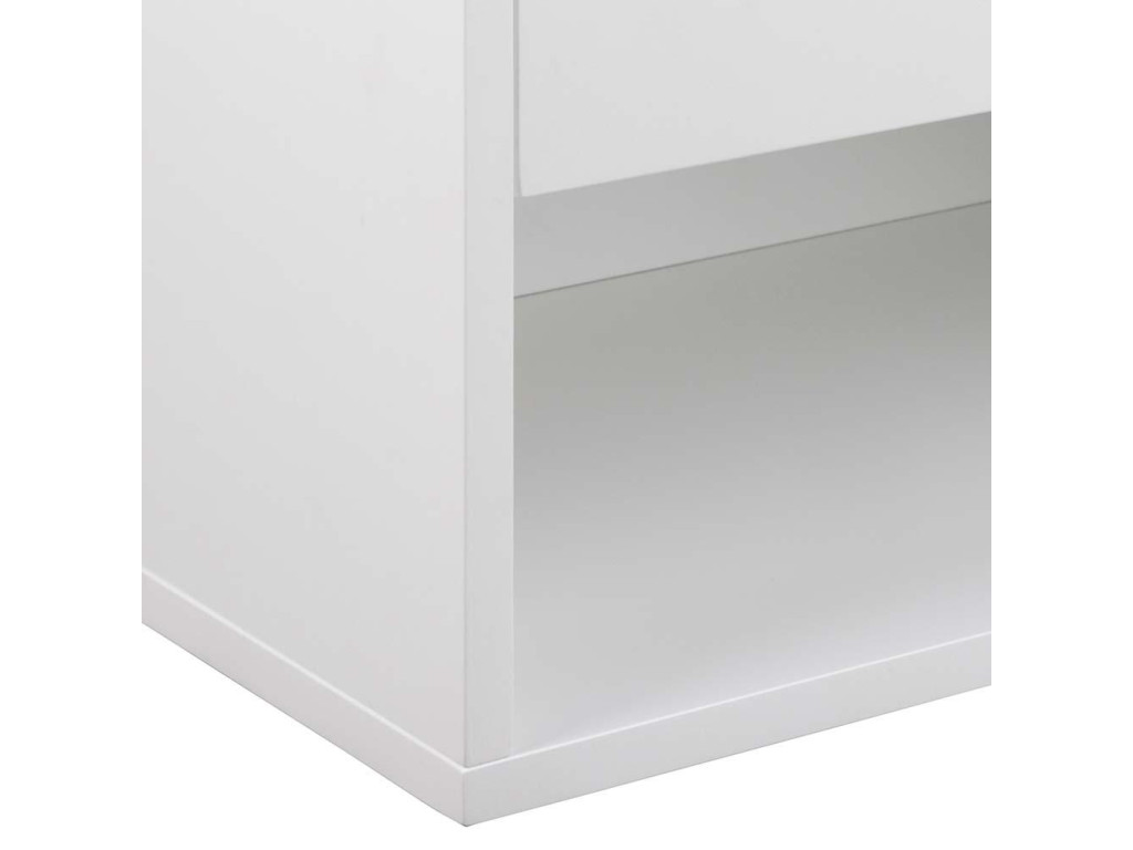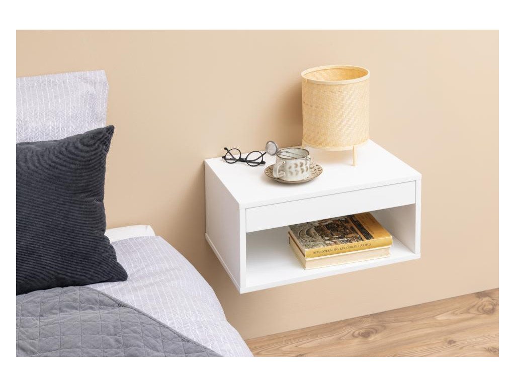 Nočný stolík Cholet predstavuje modernú kombináciu dizajnu a funkčnosti. Vďaka montáži na stenu pôsobí ľahko a vzdušne, ideálny do menších priestorov. Biela UV lakovaná MDF konštrukcia doplnená zásuvkou s plným výsuvom a otvorenou priehradkou poskytuje praktický úložný priestor na všetko potrebné. Jeho elegantný vzhľad sa hodí do spálne, ale aj do študentskej izby.