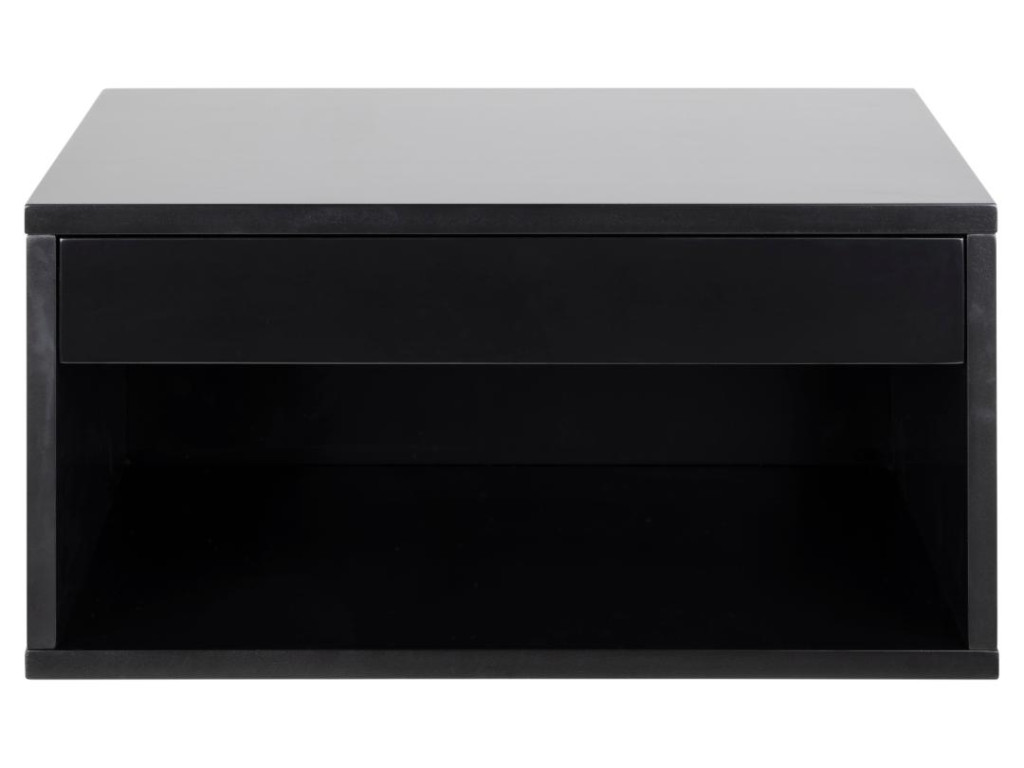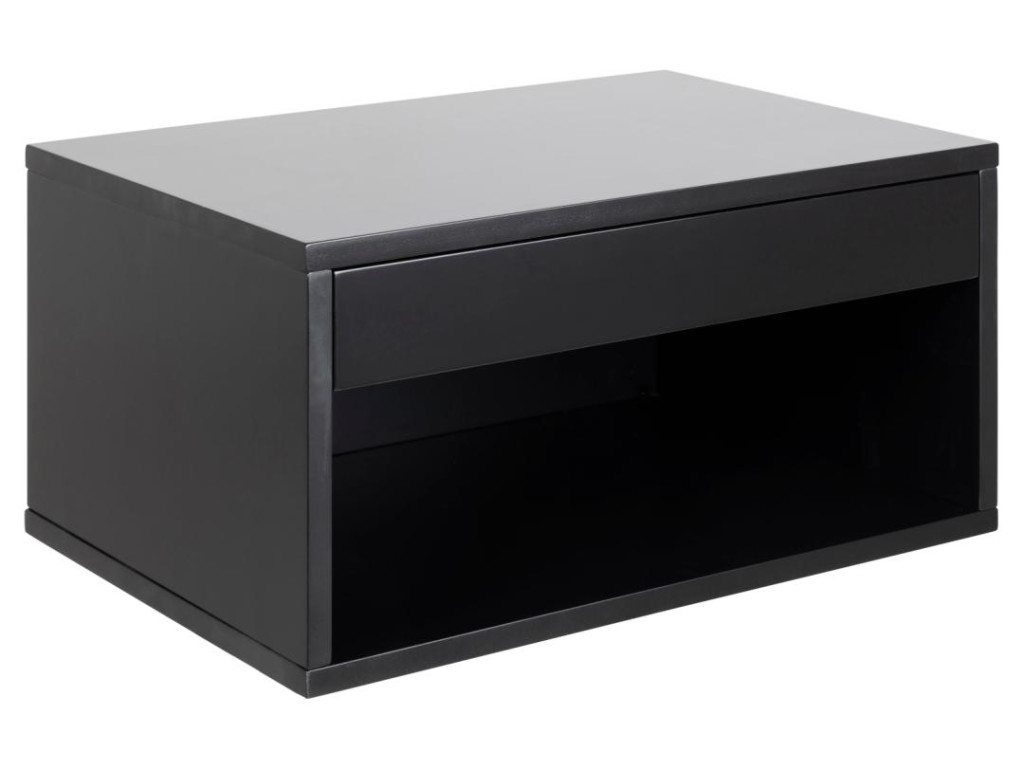 Nočný stolík Cholet v čiernej farbe ponúka praktické riešenie pre vašu spálňu. Elegantný matný dizajn s UV lakovanou povrchovou úpravou pôsobí moderne a vkusne. Zásuvka s plným výsuvom a otvorená priehradka poskytujú dostatok priestoru na uloženie drobností. Vďaka montáži na stenu pôsobí ľahko a šetrí miesto.