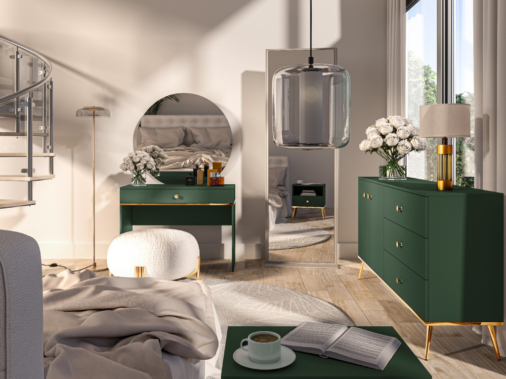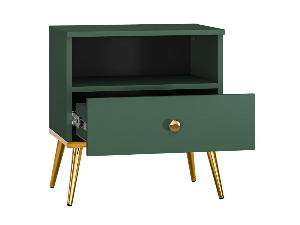 Nočný stolík Flora 06 v tmavozelenej farbe so zásuvkou na drobnosti a hornou doskou na dekorácie či lampu prinesie do spálne eleganciu prírody. Zlatá úchytka a vysoké nožičky pridávajú stolíku sofistikovaný vzhľad.