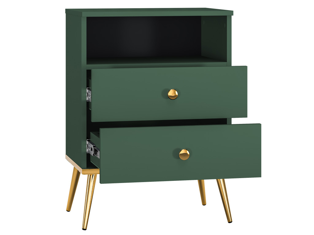 Nočný stolík Flora 10 v elegantnej tmavozelenej farbe s dvoma zásuvkami a zlatými úchytkami prináša do spálne pokoj a nádych prírody. Je ideálnym doplnkom pre vytvorenie harmonického a štýlového priestoru.