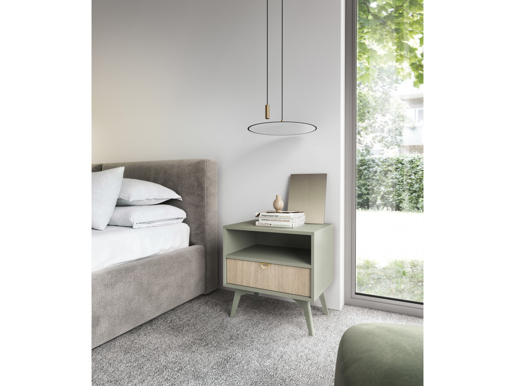 Nočný stolík Forest je kus nábytku, ktorý by nemal chýbať v žiadnej spálni. Korpus stolíka je v zelenej farbe, čelo zásuvky v béžovej farbe so vzorom rybej kosti.