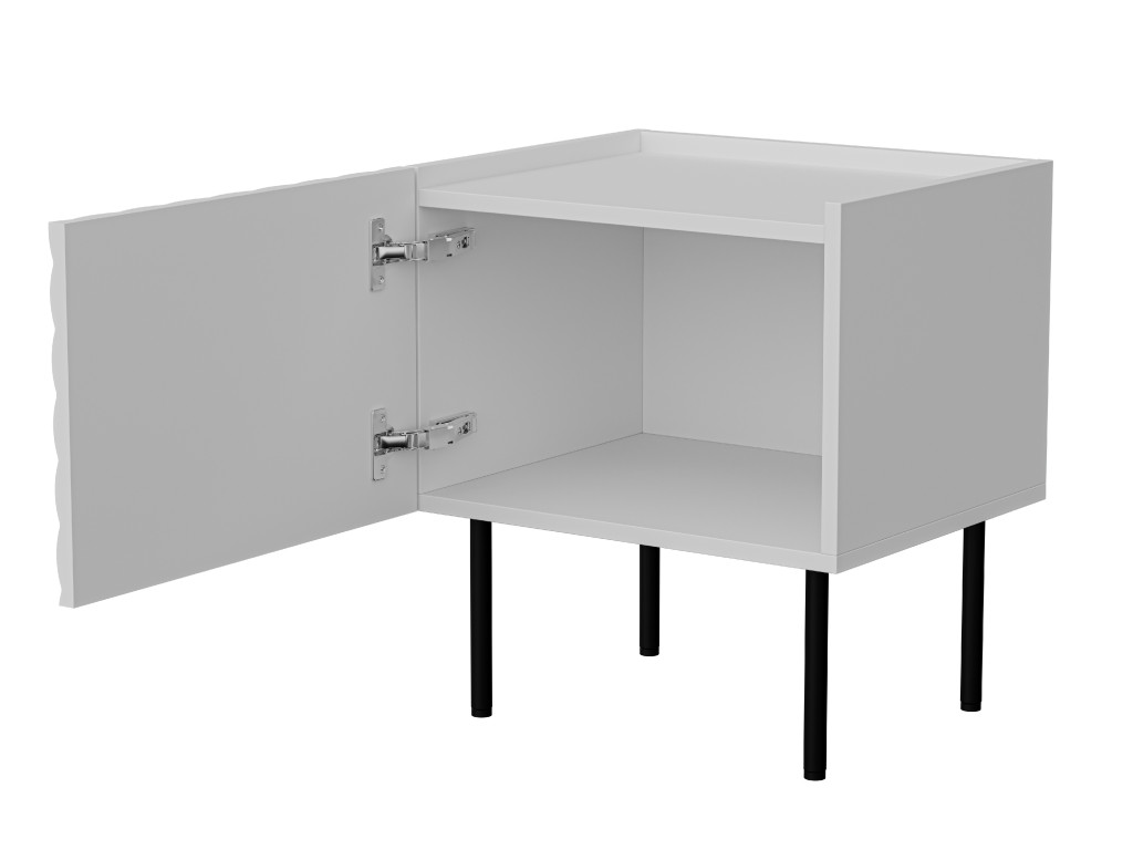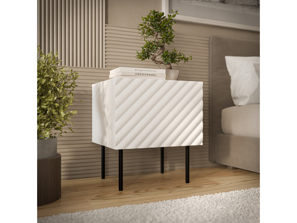 Čelá stolíka sú vyrobené z MDF dosky s diagonálnym oblým frézovaním, ktoré tvorí decentný reliéf a dodáva hĺbku. Otváranie zabezpečuje prakticky vystupujúce čelo bez potreby úchytiek, čo pôsobí čisto a funkčne. Stolík stojí na čiernych kovových nožičkách s výškou 20 cm, vďaka čomu pôsobí vzdušne. K dispozícii sú tri farebné prevedenia – biela, čierna a béžová, aby ladil do akéhokoľvek štýlu spálne.