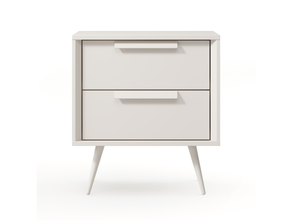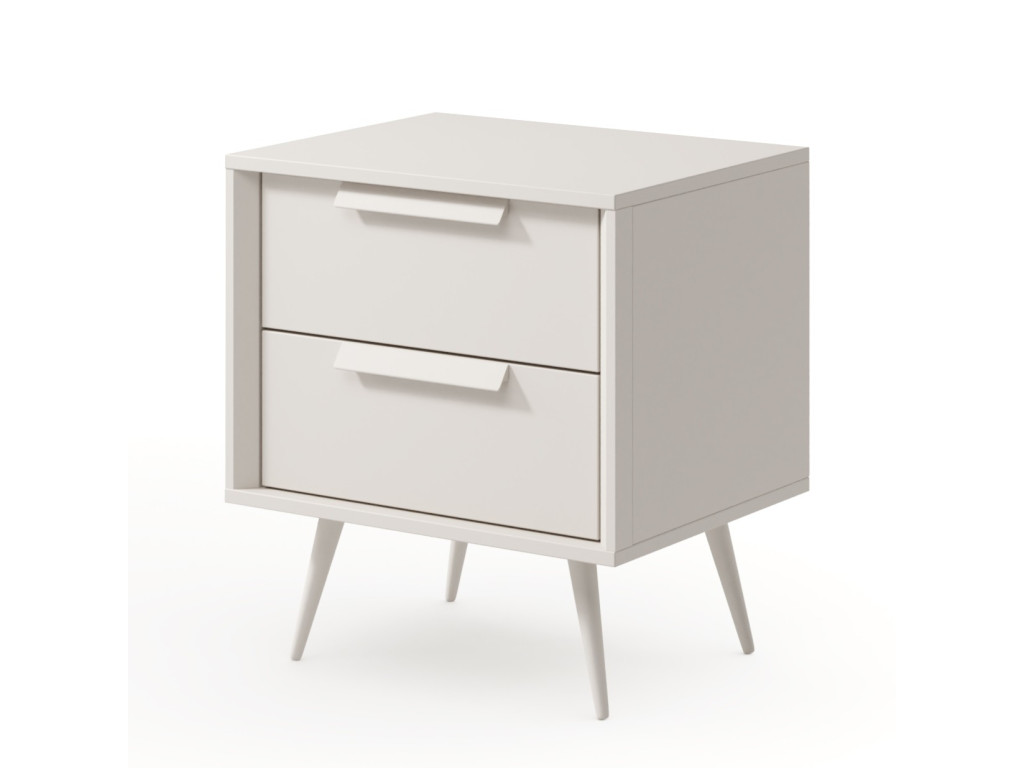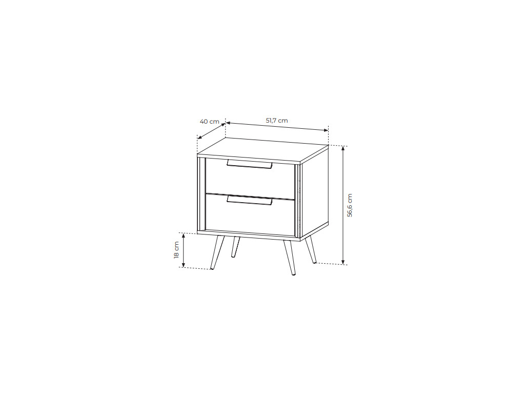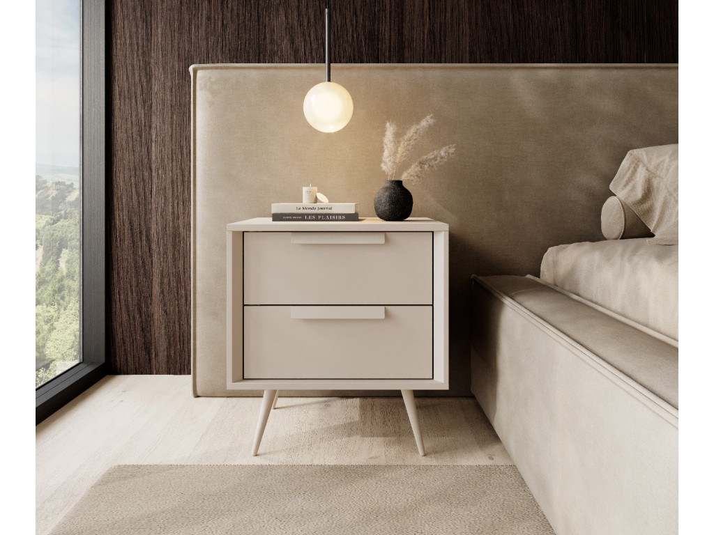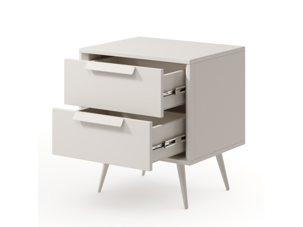 Nočný stolík je vybavený dvomi zásuvkami, ktoré poskytujú praktický úložný priestor na drobnosti. Vyhotovený je v odtieni béžová (kašmír) s dôrazom na jednoduchý a moderný dizajn. Zásuvky sú doplnené o kovové úchyty pre pohodlné otváranie. Stabilitu zabezpečujú kovové nohy v rovnakom farebnom prevedení.