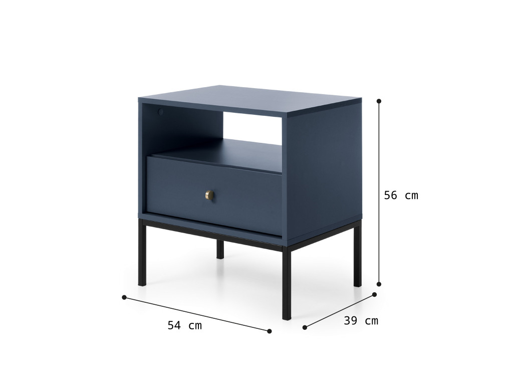 Netradičný modrý nočný stolík Mono v odtieni navy upúta už na prvý pohľad. Je zhotovený z DTD a laminátu s ABS hranami, vďaka čomu výborne odoláva poškodeniu. Otváranie zásuvky je zaistené prostredníctvom kovového úchytu zlatej farby.