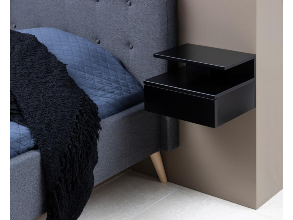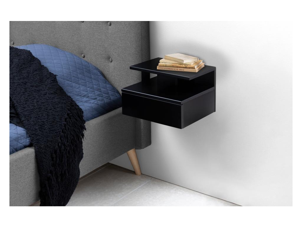 Minimalizmus, ktorý púta pozornosť. Nočný stolík Ashlan v čiernom matnom prevedení vyniká modernou jednoduchosťou a schopnosťou zapadnúť do každého štýlu spálne. Vďaka montáži na stenu vytvára plávajúci efekt a opticky odľahčuje priestor. Praktická zásuvka s kovovými koľajničkami a plným výsuvom poskytuje dostatok miesta na uloženie drobností, zatiaľ čo otvorená polička zabezpečí rýchly prístup k tým najpotrebnejším veciam. Povrch z odolného materiálu je ľahko udržiavateľný a nenáročný na priestor.