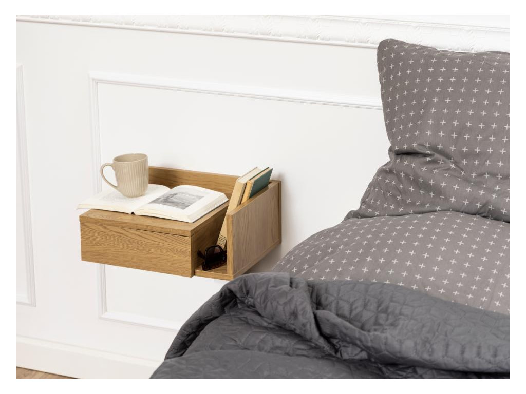 Prírodný vzhľad v modernom balení. Variant v dekore matného divokého duba prináša do spálne teplý, útulný nádych. Obdĺžniková zásuvka a otvorená polička poskytujú praktické riešenie na drobnosti, zatiaľ čo možnosť otočnej montáže zabezpečuje maximálnu flexibilitu. Povrch s drsnou štruktúrou papiera imituje surové drevo a pôsobí autenticky. Tento model je ideálny do škandinávskych či prírodne ladených interiérov.