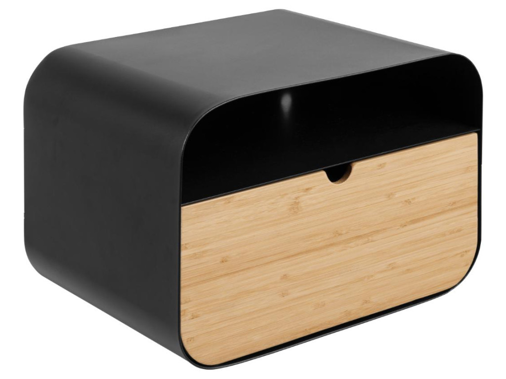 Bambusová zásuvka je ideálna na schovanie drobností, zatiaľ čo vrchná kovová plocha slúži na odkladanie kníh, telefónu či dekorácií. Stôl sa montuje na stenu, čím šetrí priestor a vytvára vzdušný dojem.